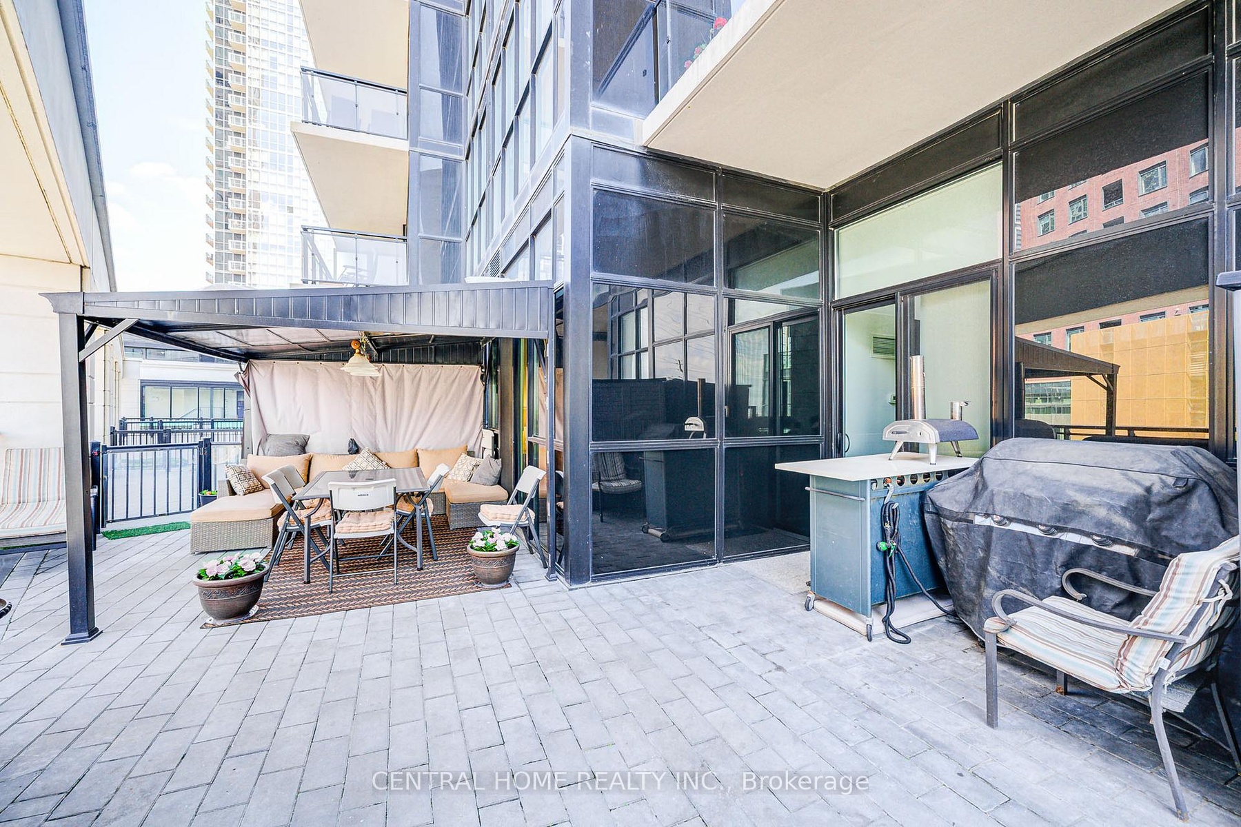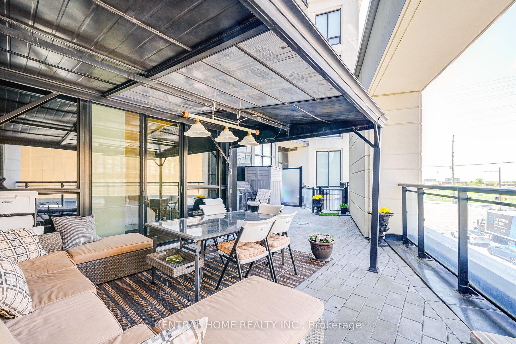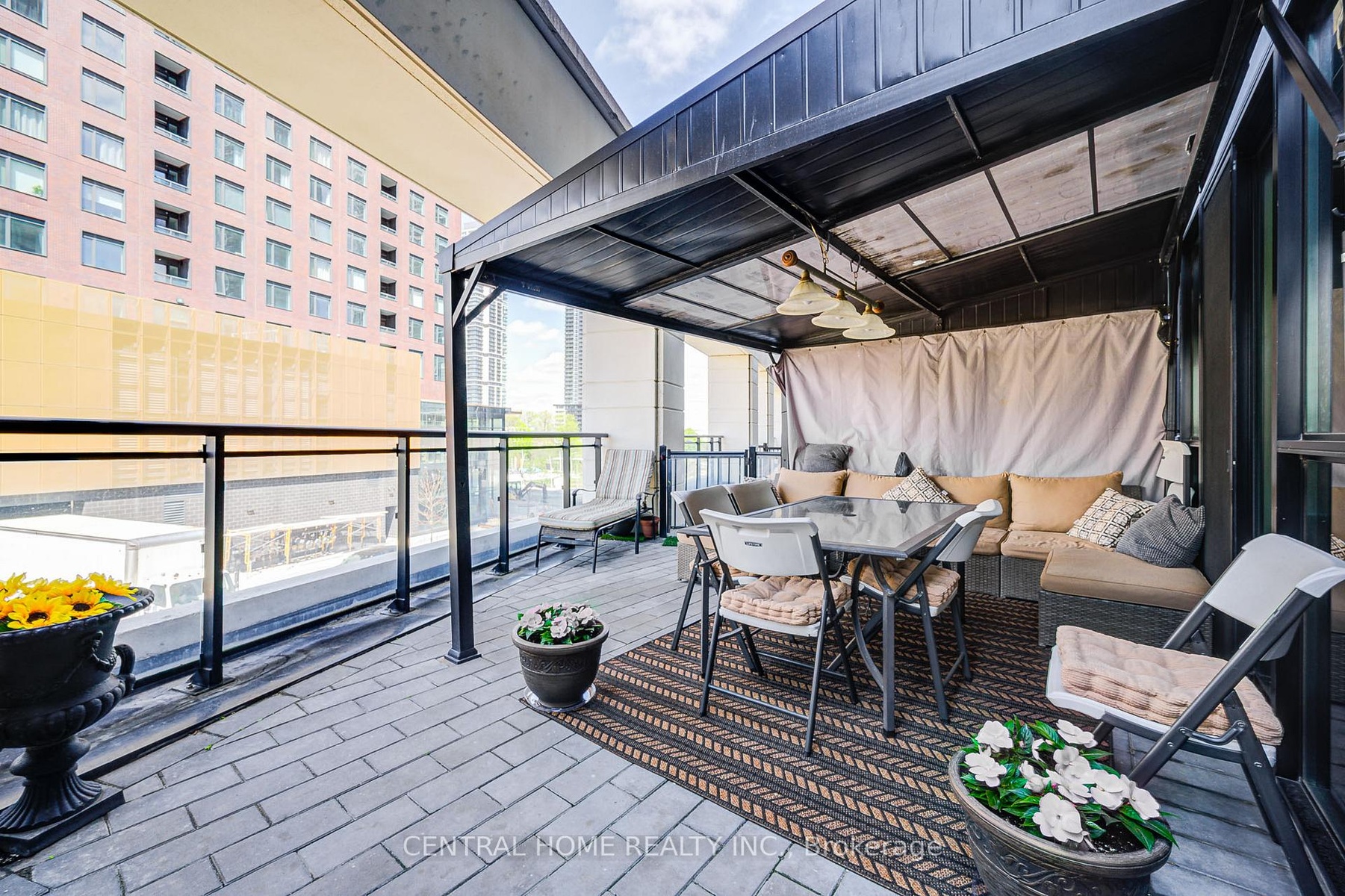 A rare opportunity to own an exceptional, sun-drenched condo offering over 900 sq ft of elegant living space with soaring 10-ft ceilings and a thoughtfully designed open-concept layout. Enjoy over 350 sq ft of exclusive-use terrace equipped with gas, water, and electrical connections ideal for outdoor entertaining. Situated on the 2nd floor, just steps from premier amenities including a party room, gym, yoga studio, indoor pool, childrens play area, and more. Beautifully appointed with contemporary finishes and floor-to-ceiling windows for an abundance of natural light. Prime location near the subway, 24/7 shopping, university, indoor/outdoor play areas, medical clinic, and pharmacy. Quick access to Hwy 407 & 400. Includes an oversized P1 parking spot near the elevator and a large private storage locker. A perfect blend of style, space, and comfort ideal for professionals, couples, or downsizers.