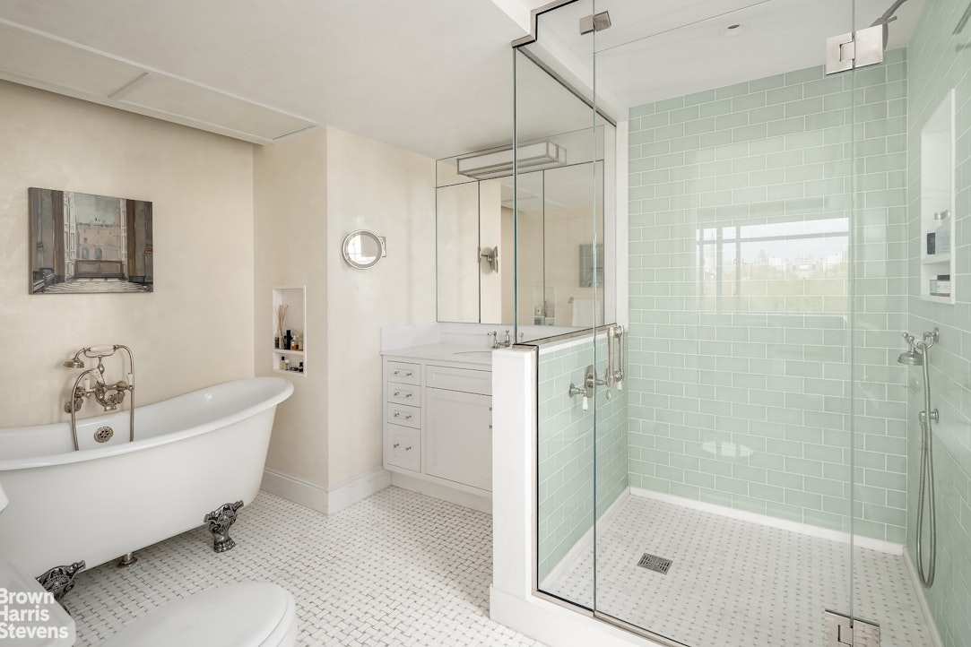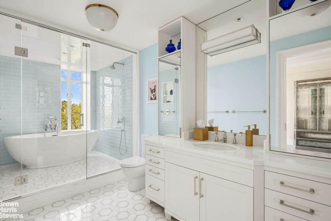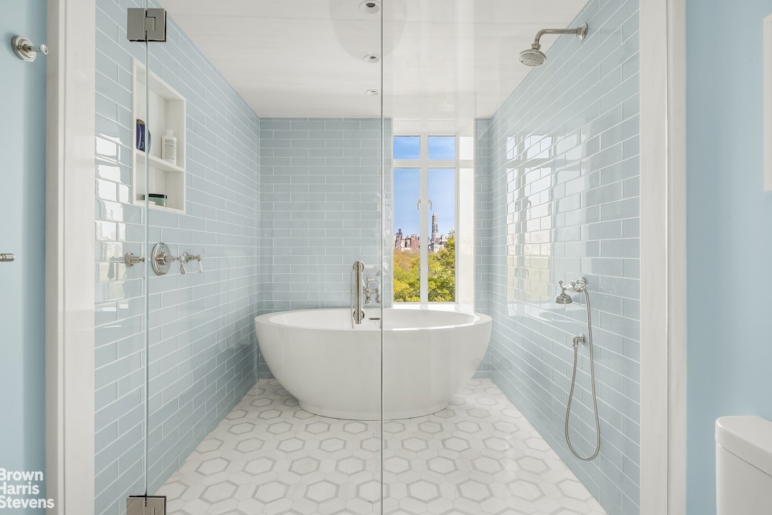 Second Primary Suite: A quiet haven with a park-facing picture window, Bain Ultra tub overlooking Central Park, a Jacuzzi Clearlight Sanctuary 2 sauna, and radiant-heated floors