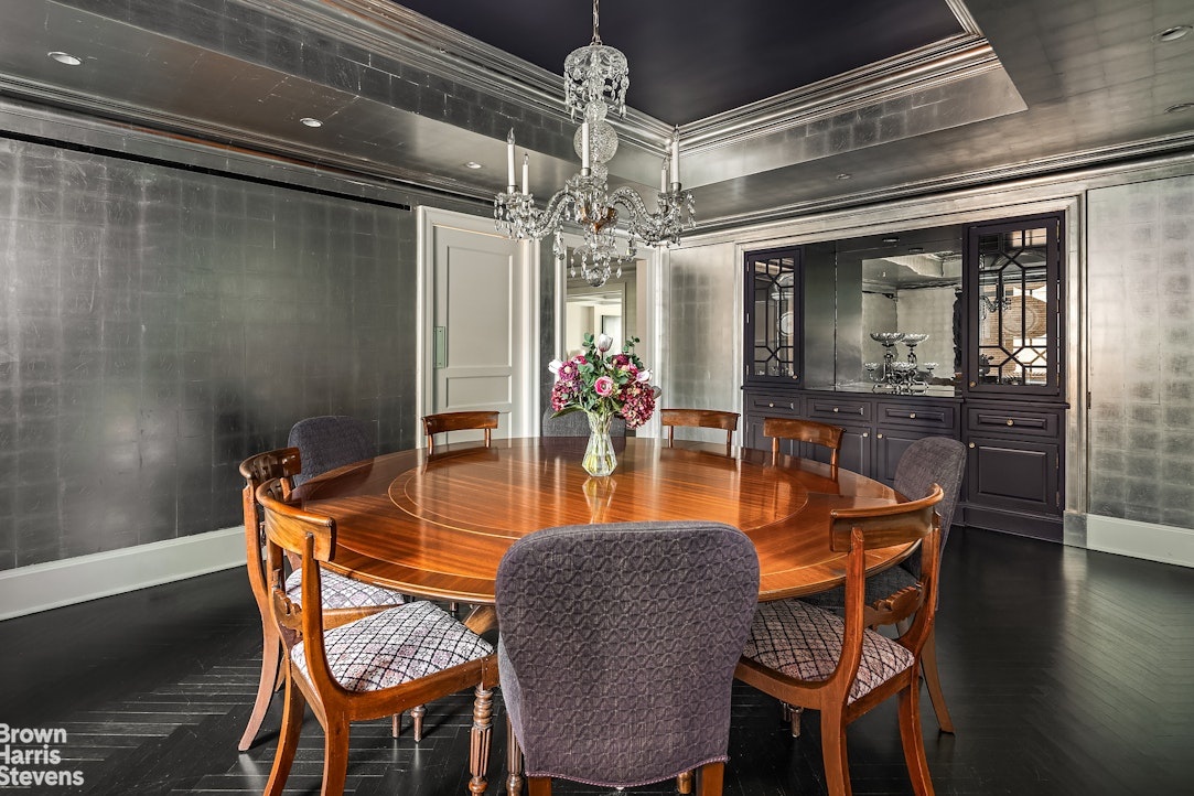 Formal square dining room with east-facing exposures and bespoke built-ins