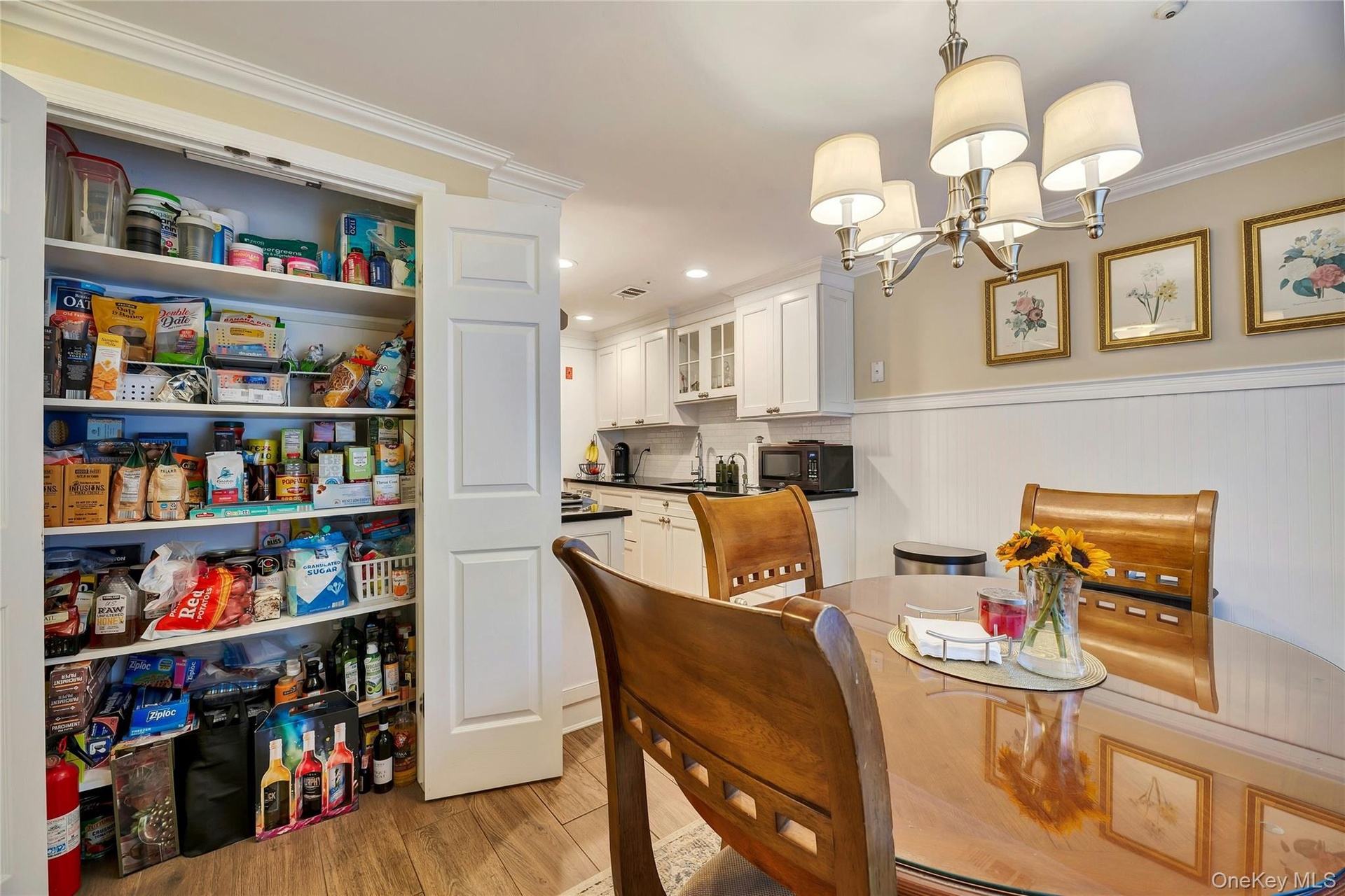 - Dining space with wainscoting, crown molding, porcelain wood-style flooring, and a chandelier