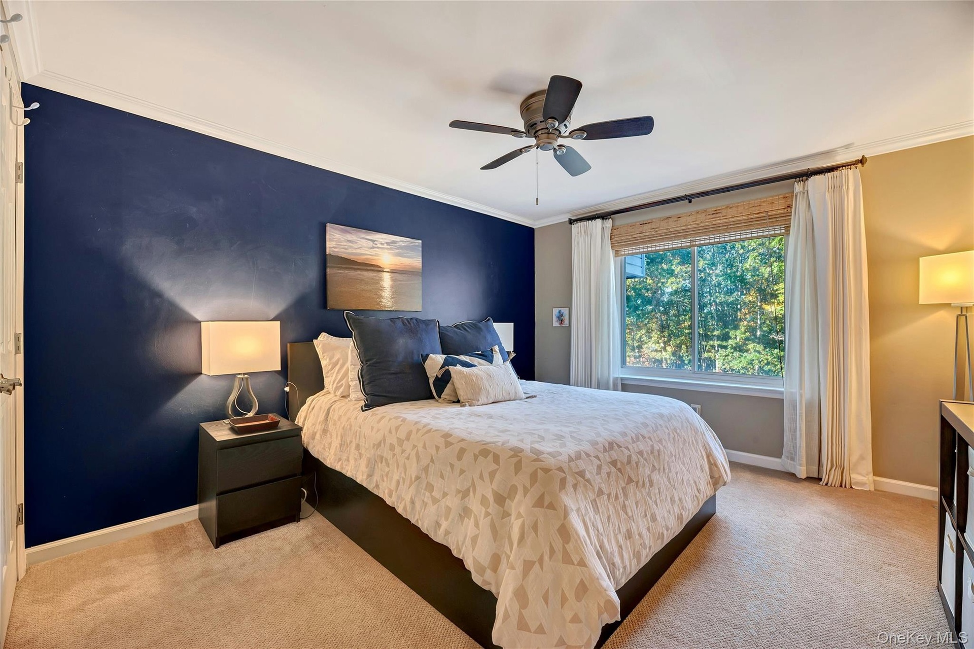 - Bedroom with ornamental molding, light colored carpet, and a ceiling fan