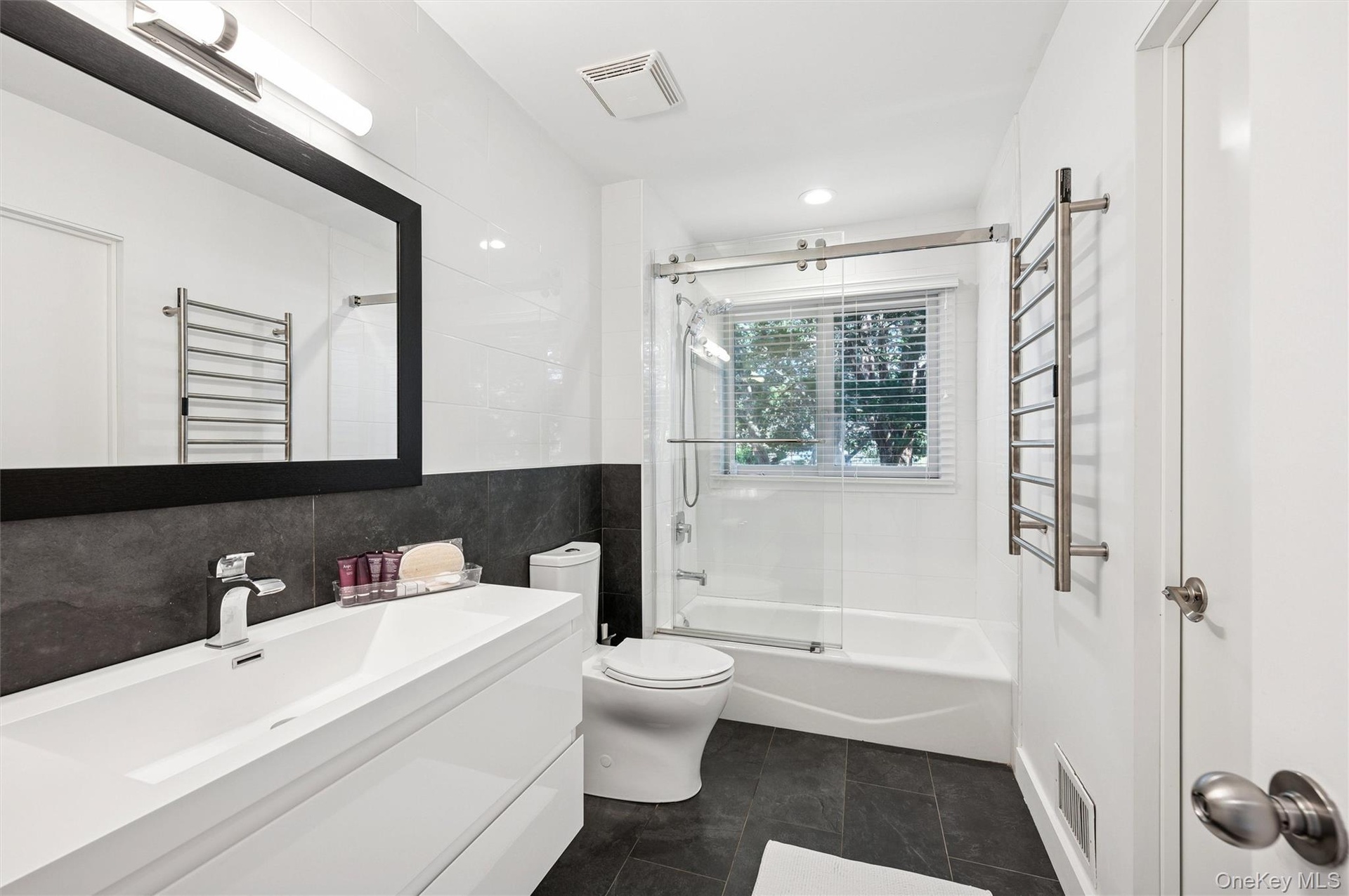 - Full bathroom with shower / bath combination with glass door, vanity, a towel warming rack, radiator heating unit, and tile walls