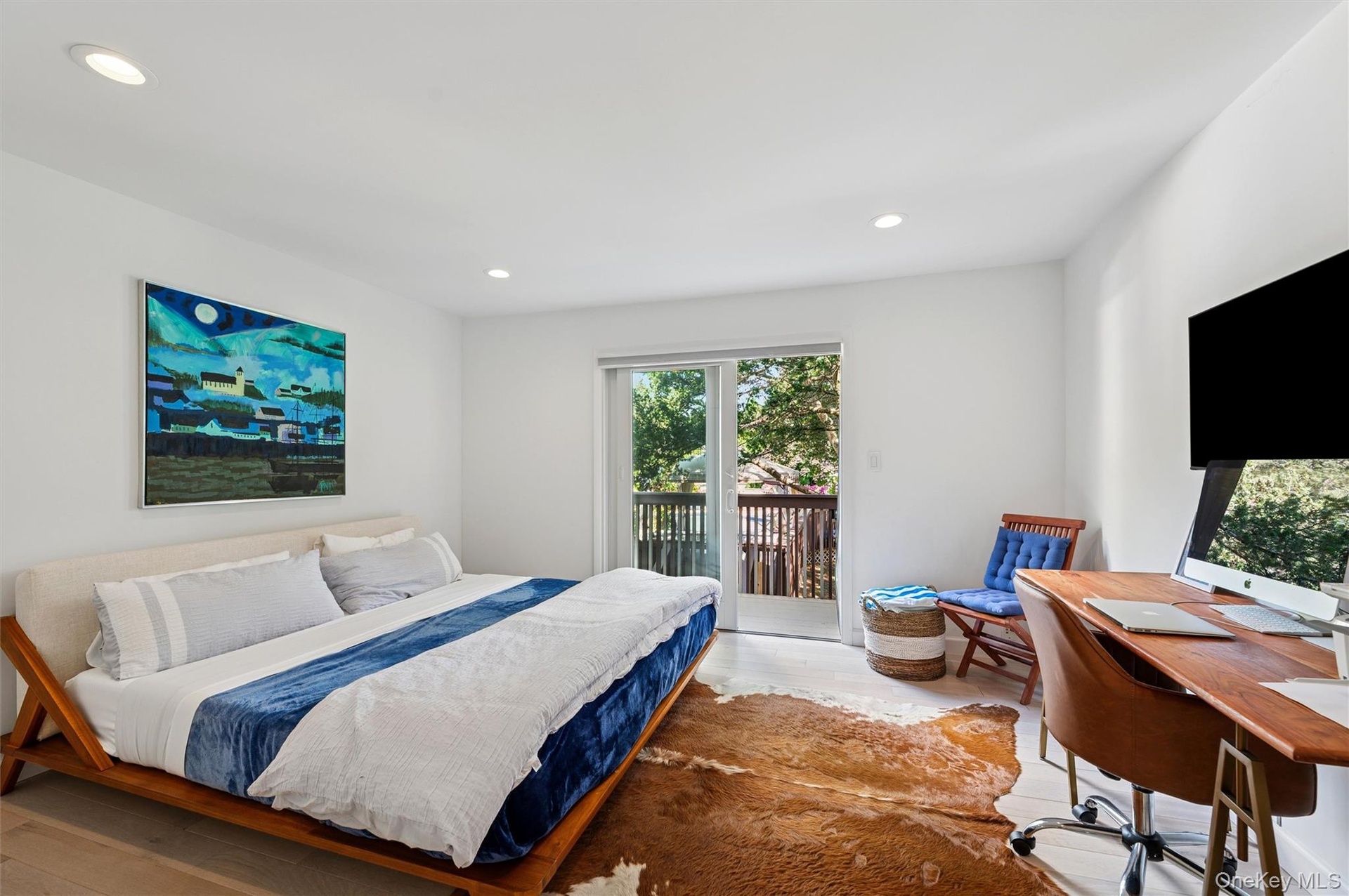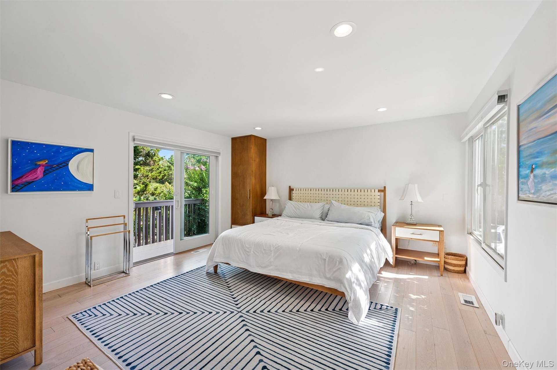 - Bedroom featuring access to exterior, recessed lighting, and light wood-type flooring