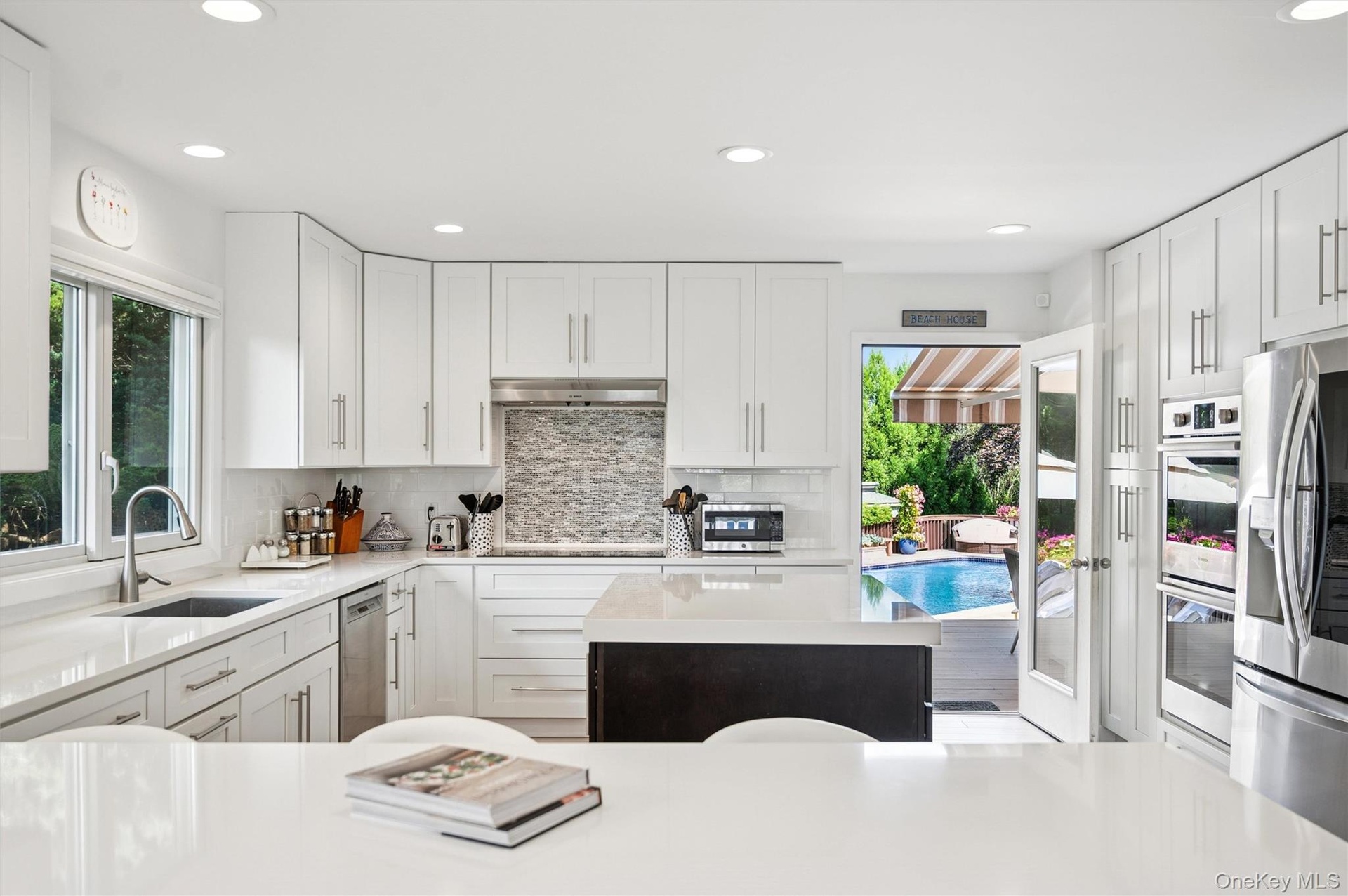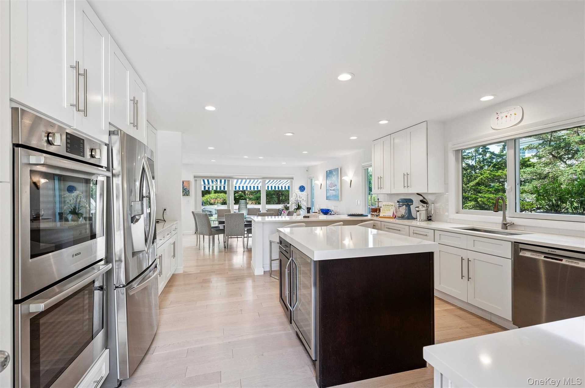 - Kitchen with stainless steel appliances, white cabinetry, a peninsula, a center island, and recessed lighting
