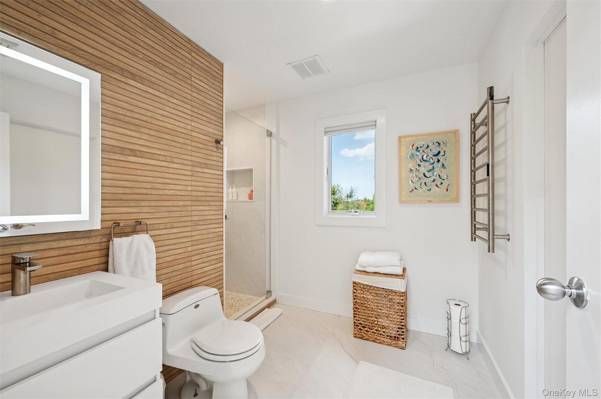 - Bathroom with a stall shower, vanity, a towel warmer, and wooden walls