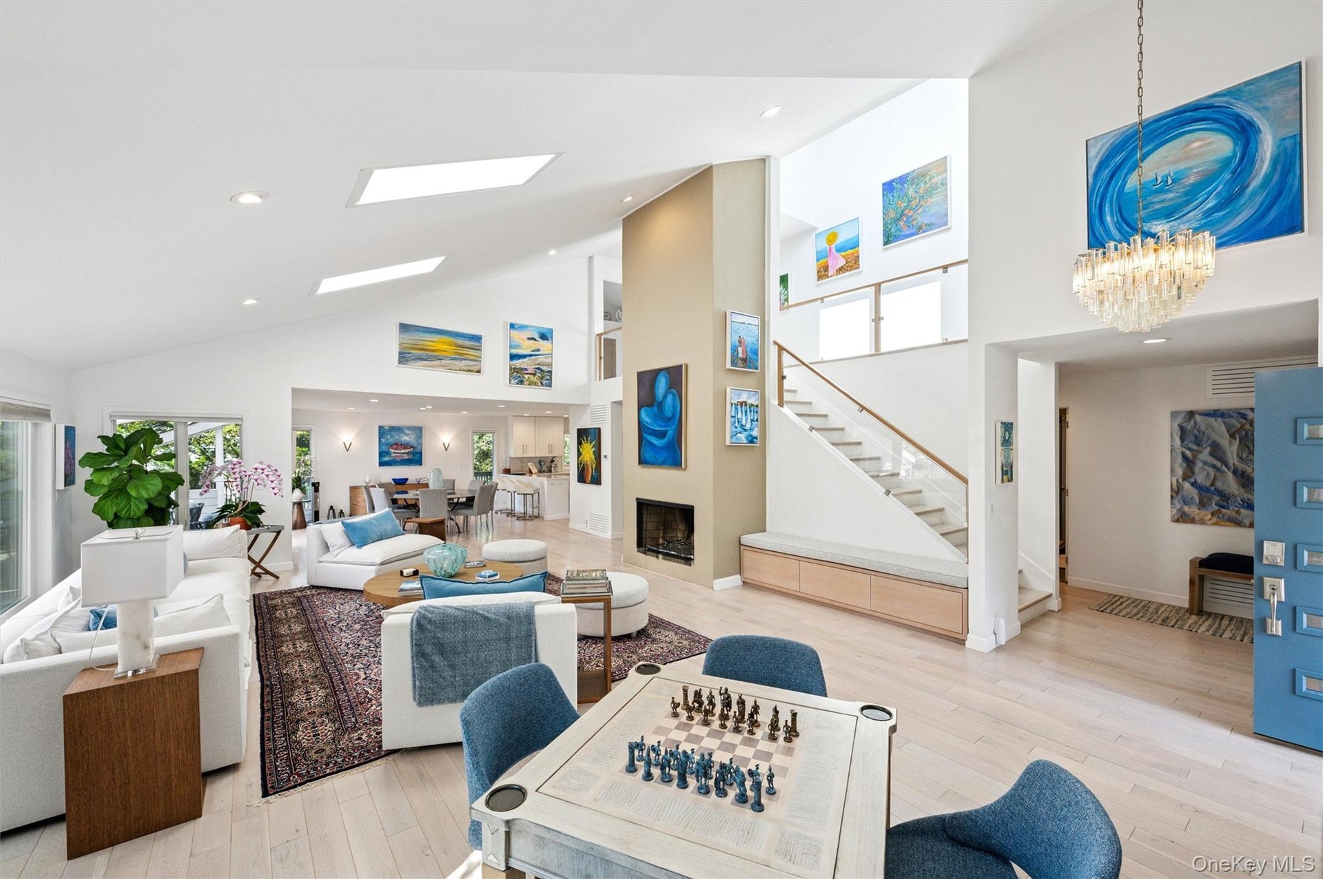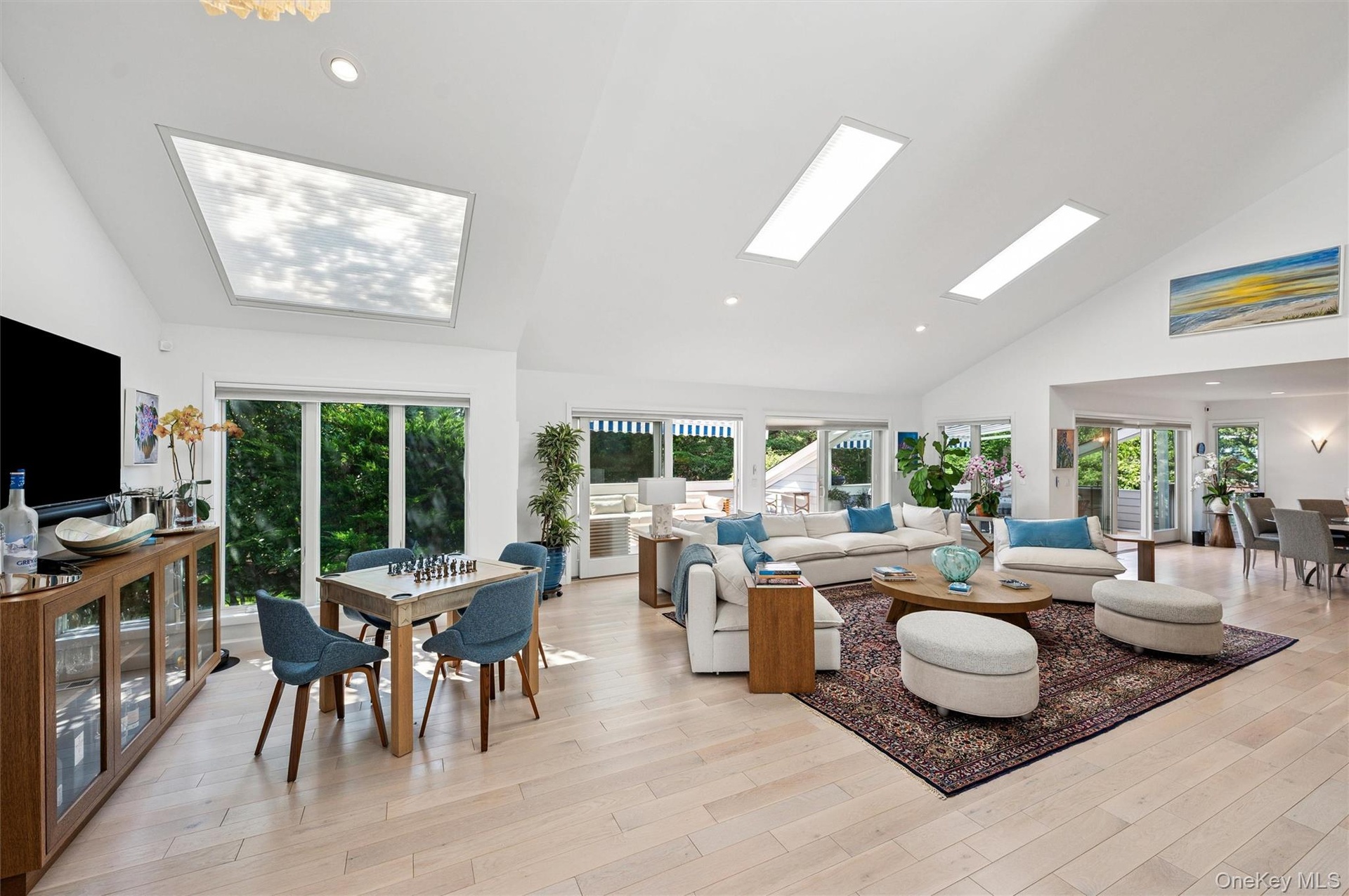 - Living area with a skylight, a fireplace, light wood-style flooring, high vaulted ceiling, and recessed lighting