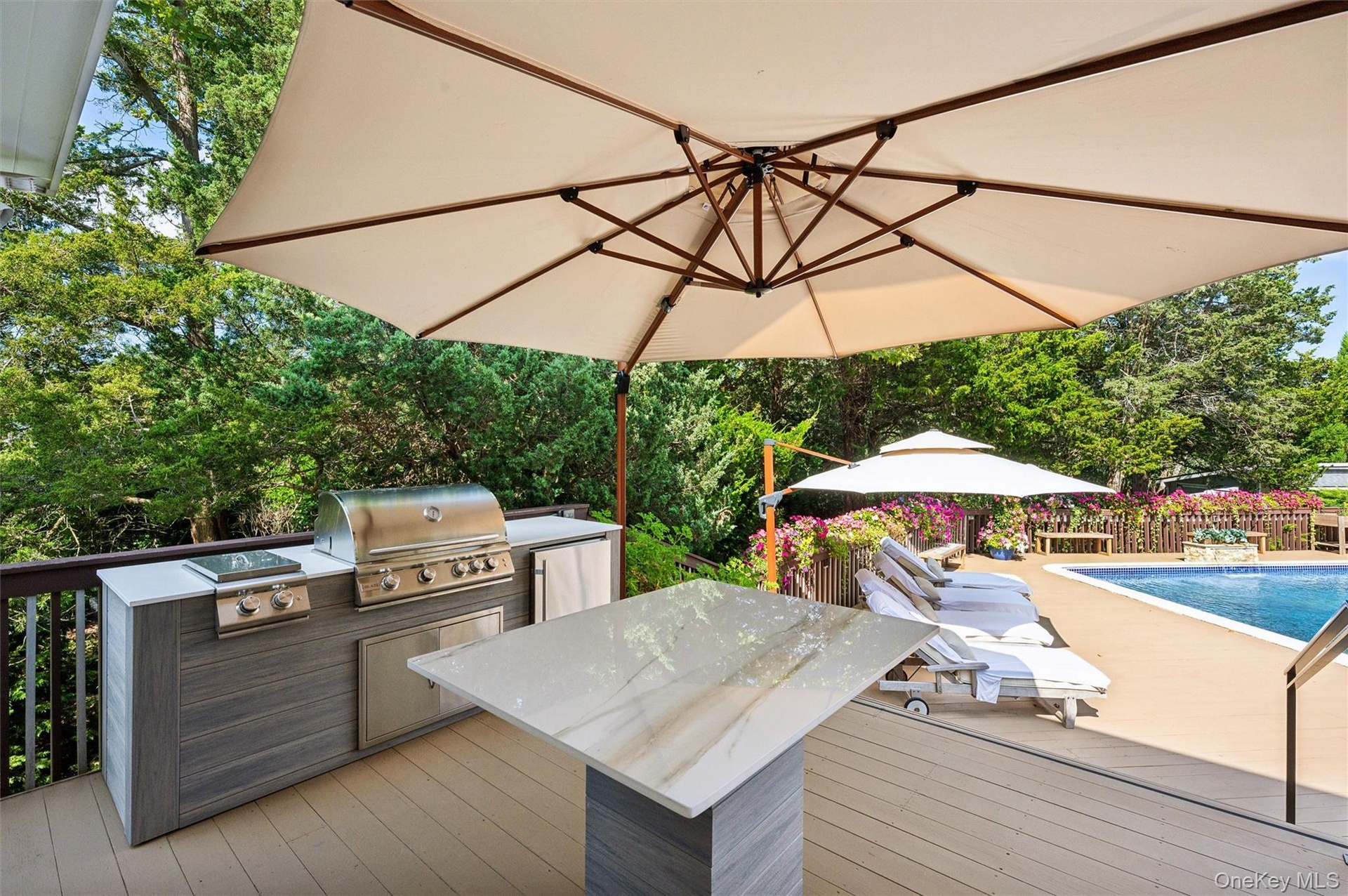 - Deck with a tennis court, a patio, and an outdoor hangout area