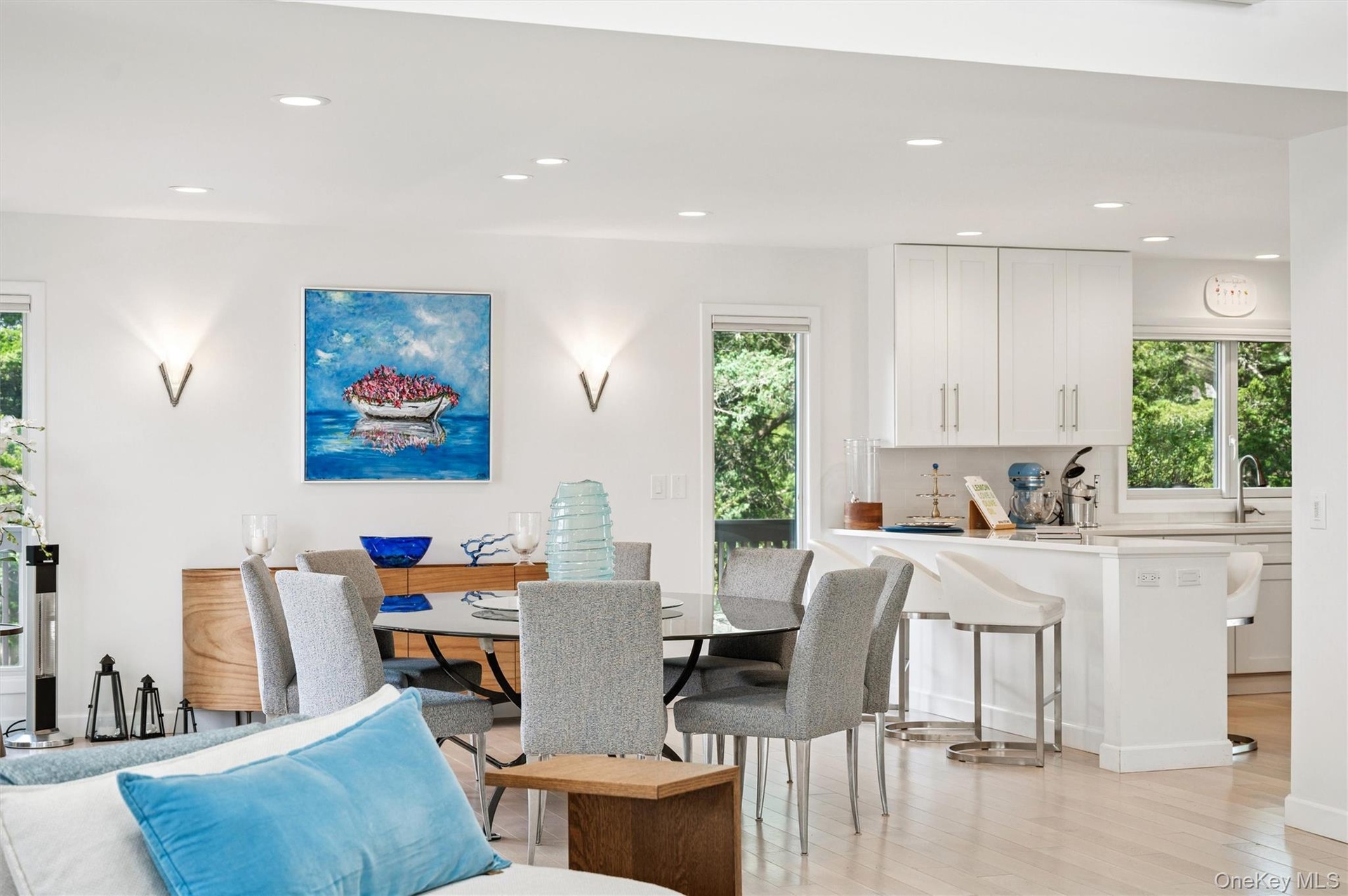 - Dining room with recessed lighting, light wood finished floors, and a skylight