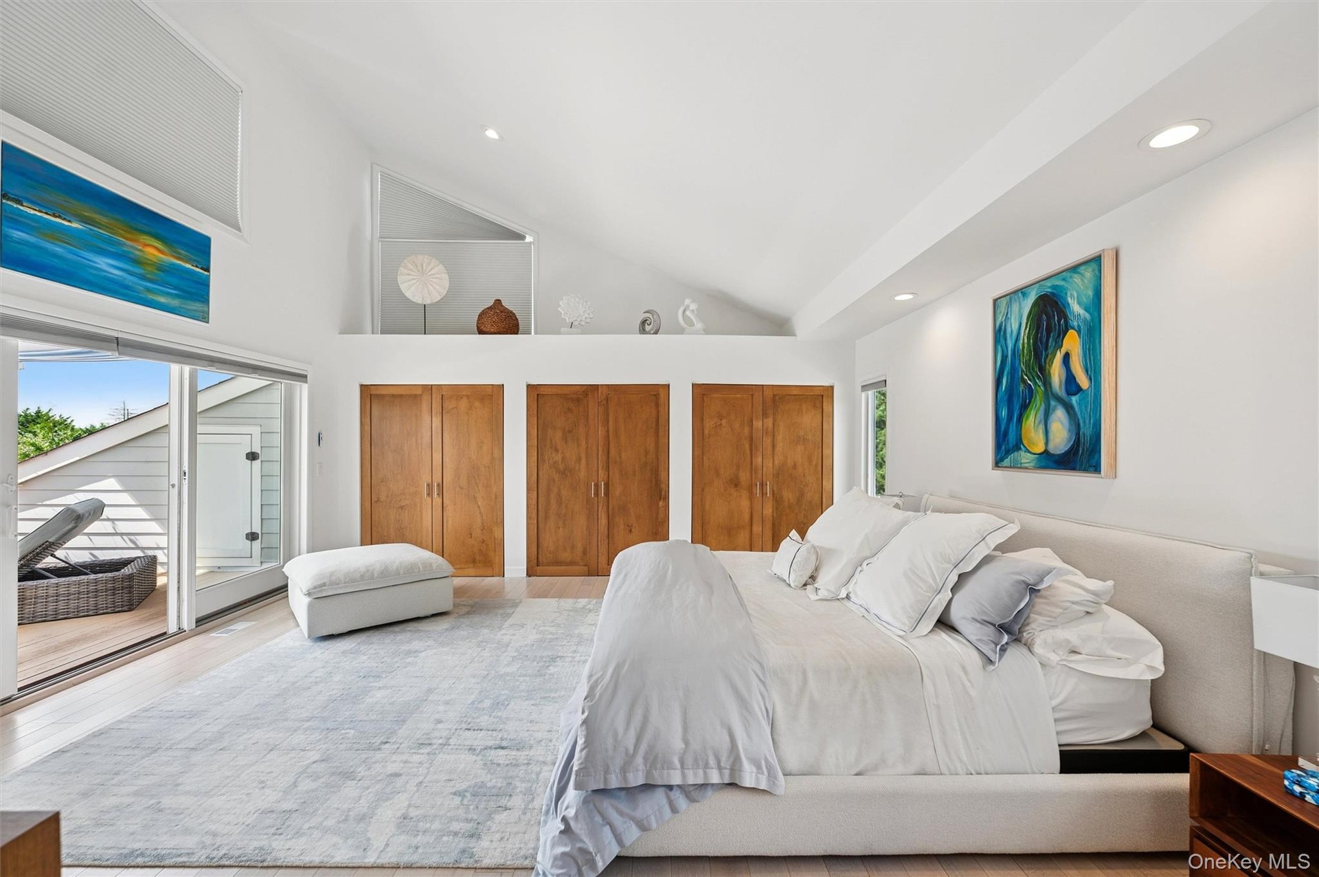 - Bedroom with multiple closets, access to exterior, high vaulted ceiling, recessed lighting, and wood finished floors
