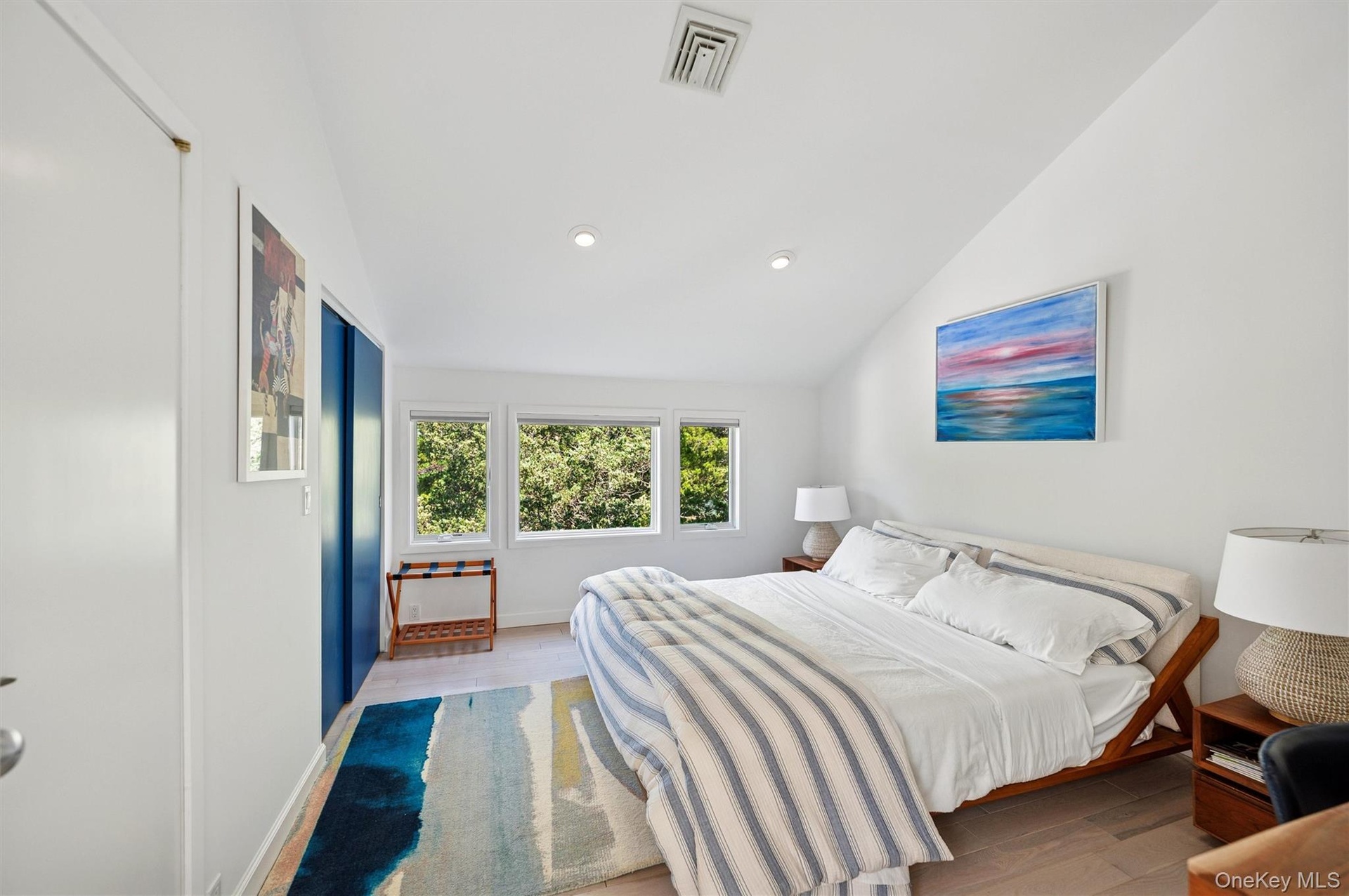- Bedroom with vaulted ceiling, wood finished floors, and recessed lighting