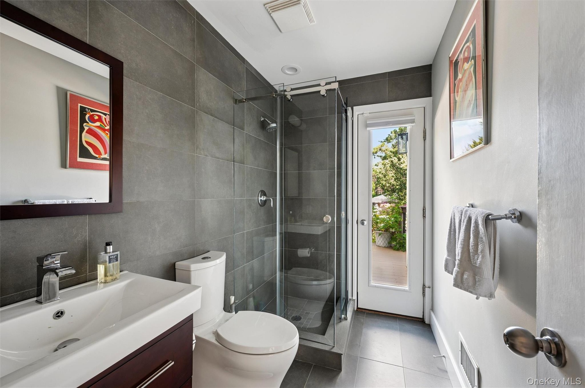- Full bath featuring tile walls, a shower stall, vanity, and dark tile patterned floors