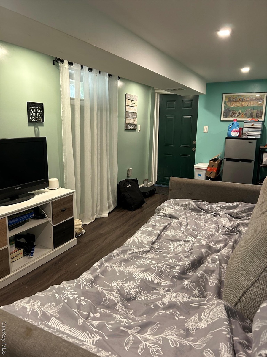 - Bedroom with refrigerator and dark wood finished floors