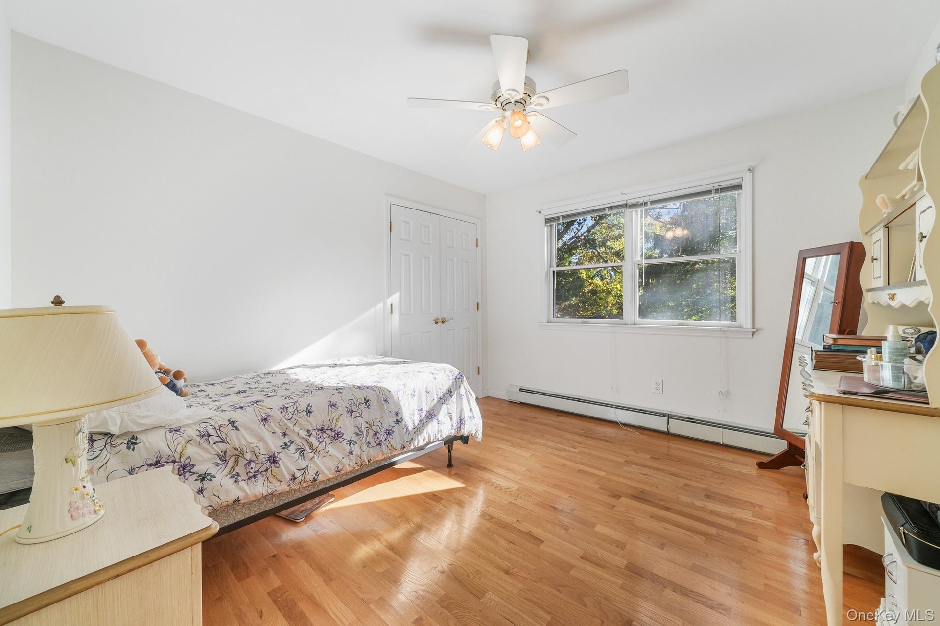 - Bedroom featuring light wood finished floors, baseboard heating, a closet, and a ceiling fan
