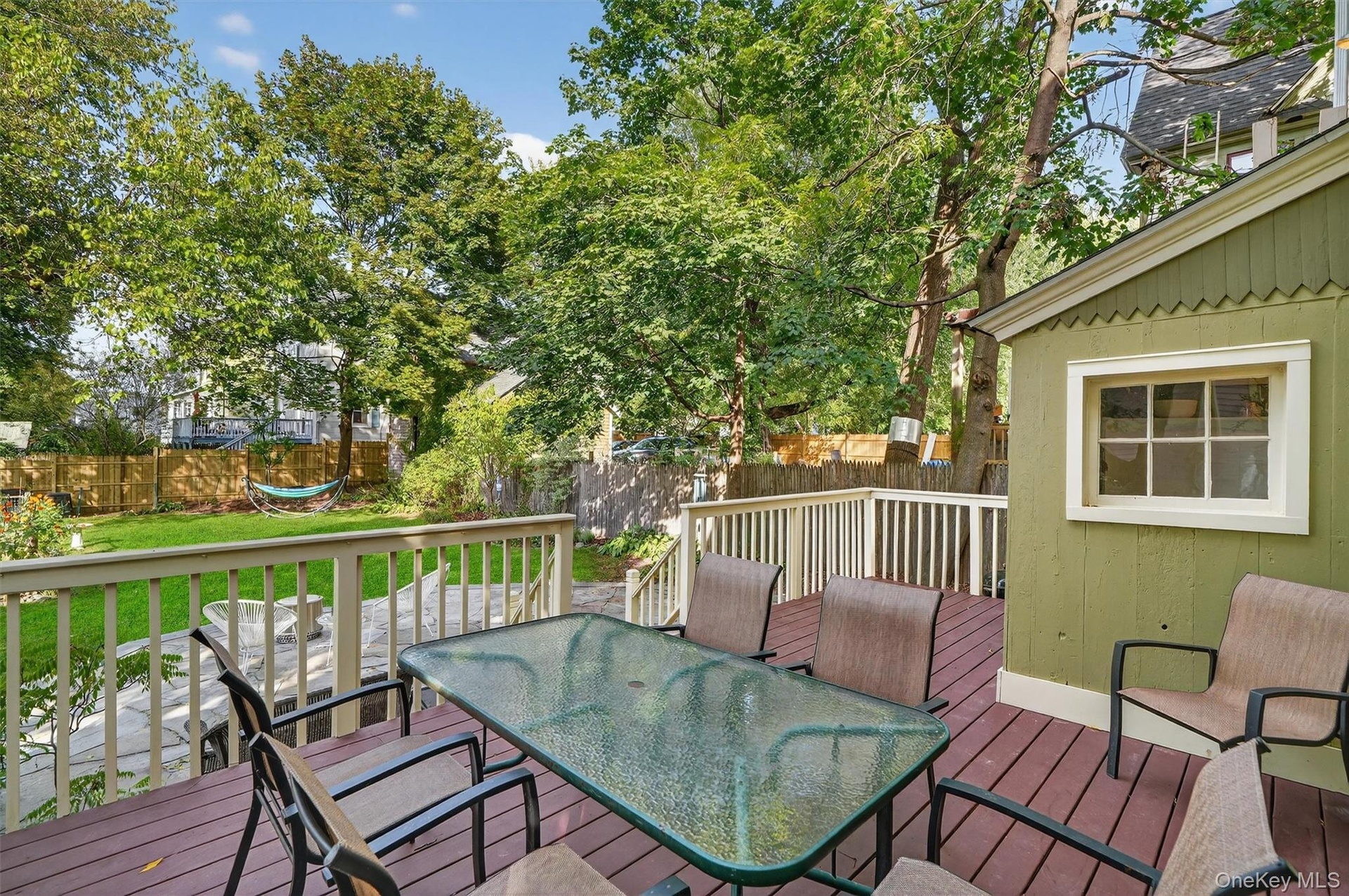 - Wooden deck featuring a fenced backyard and outdoor dining space