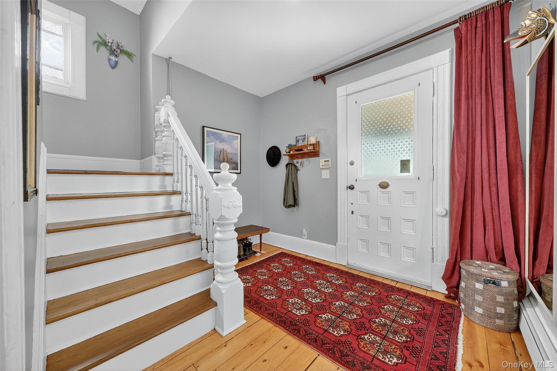 - Foyer entrance with plenty of natural light, light wood-type flooring, stairs, and a baseboard heating unit