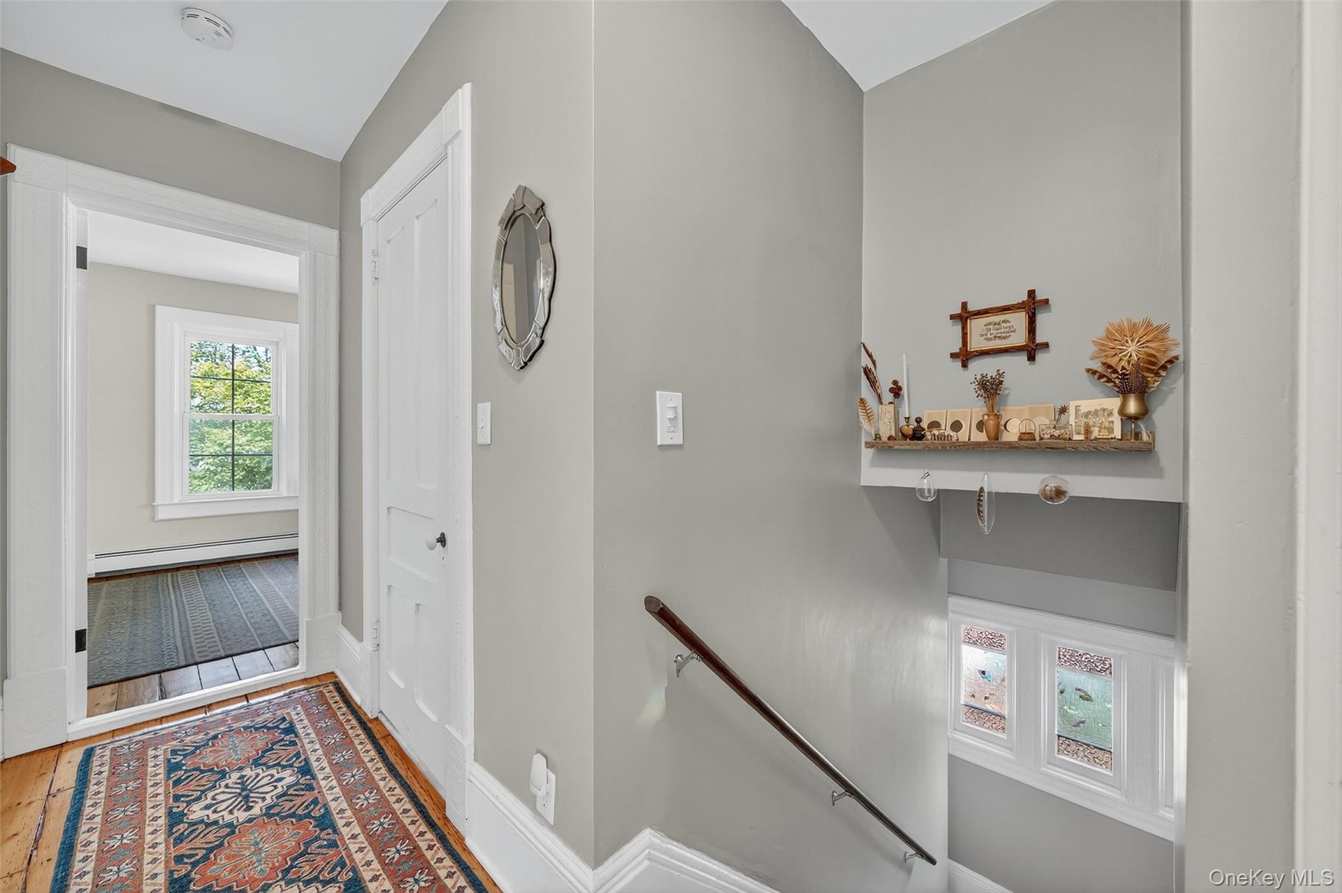 - Hallway with an upstairs landing, baseboard heating, and wood finished floors
