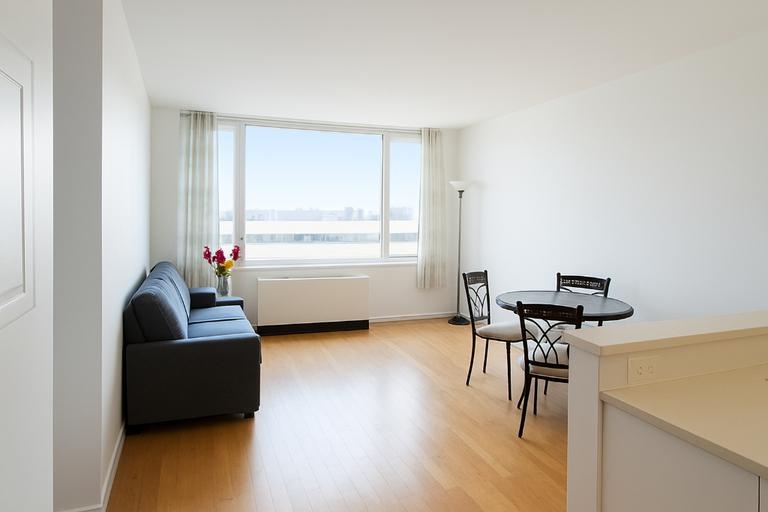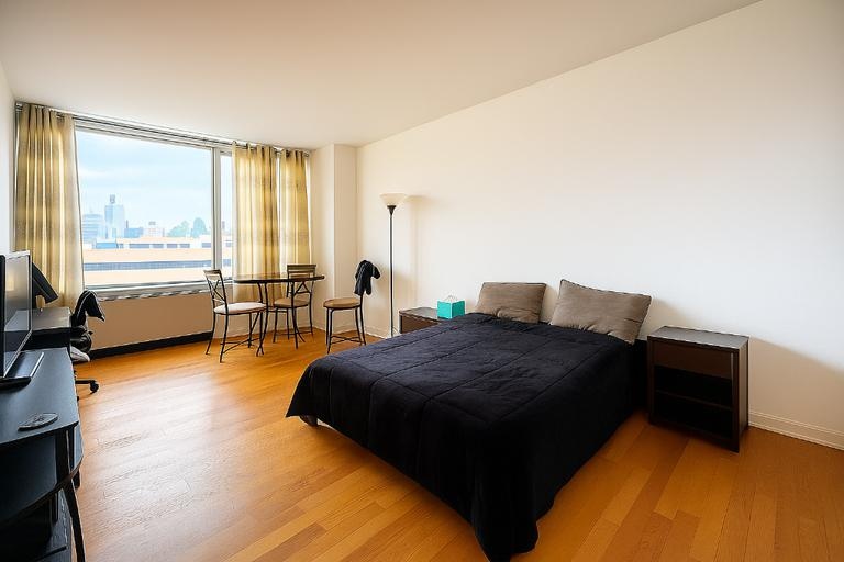 Luxurious and brilliantly sunny one bedroom with washer dryer inside the apartment. Apartment Features: high ceilings, oversize windows, and white oak flooring complemented by the pristine kitchen with its white quartz counter tops, stainless steel appliances (Sub Zero refrigerator, Bosch dishwasher, stove, convection oven, and- a rarity in NYC- a garbage disposal) and high gloss cabinets. Bianco Verde marble bathroom, , and big bedroom with plenty of closets. Facing the back with expansive sky views and very quiet! The building has concierge service, 24 hour doorman, storage space, movie theater, office center, a tennis court and a dog run, valet services, parking garage onsite, basketball court, private garden, fitness center, rooftop Sky Lounge with jaw dropping views of the Hudson River and the Manhattan skyline, landscaped garden with barbecue, multi-media lounge, billiards room, and cold storage for food deliveries.