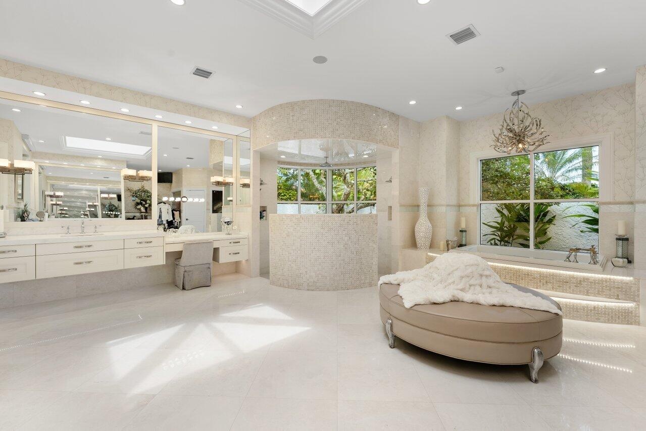 Proudly offered on a premium one acre double lot this stunning estate delivers over 12,000 sq. ft. of refined luxury living with breathtaking wraparound lake and golf course views framed by Florida's signature sunsets in Frenchman's Creek. Over the last few years this spectacular home has been fully renovated and modernized while still retaining its majestic charm. As you step inside this truly unique renovated estate offering 7 generously sized bedrooms and 8.5 bathrooms, gorgeous marble flooring leads your eye to soaring volume ceilings with stunning wood beams and classic architectural details with walls of windows open to the spectacular views and an abundance of natural light.