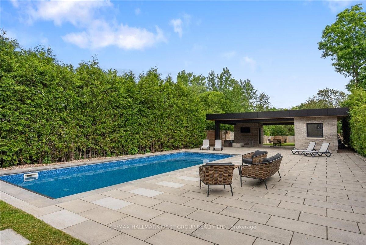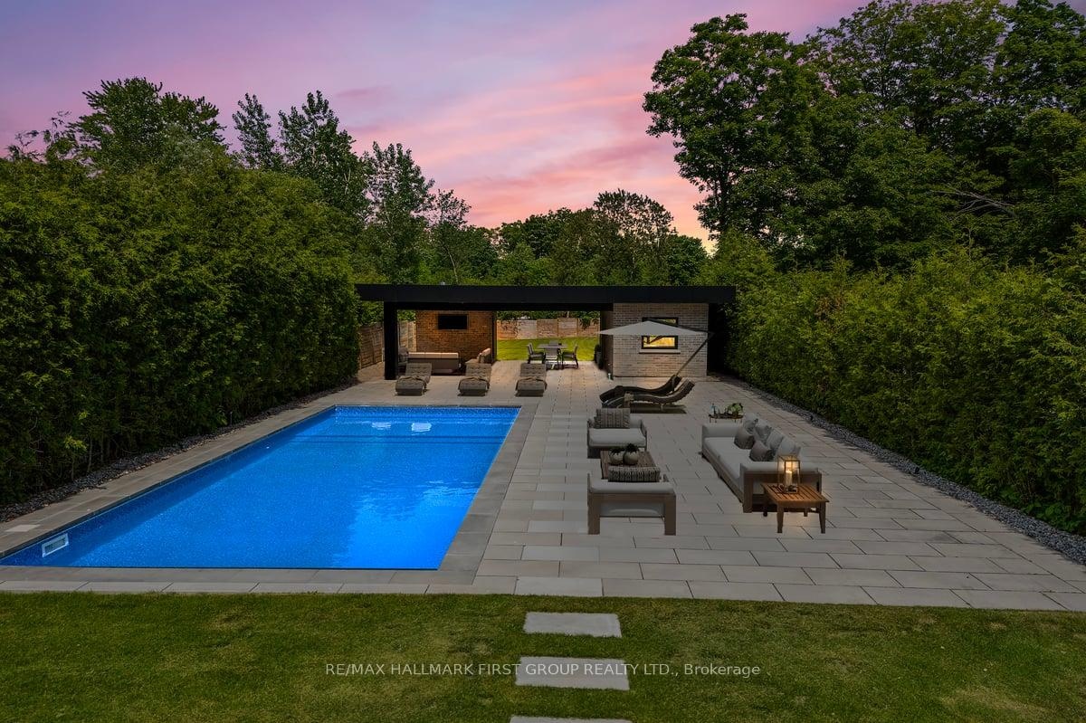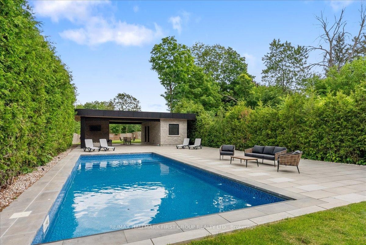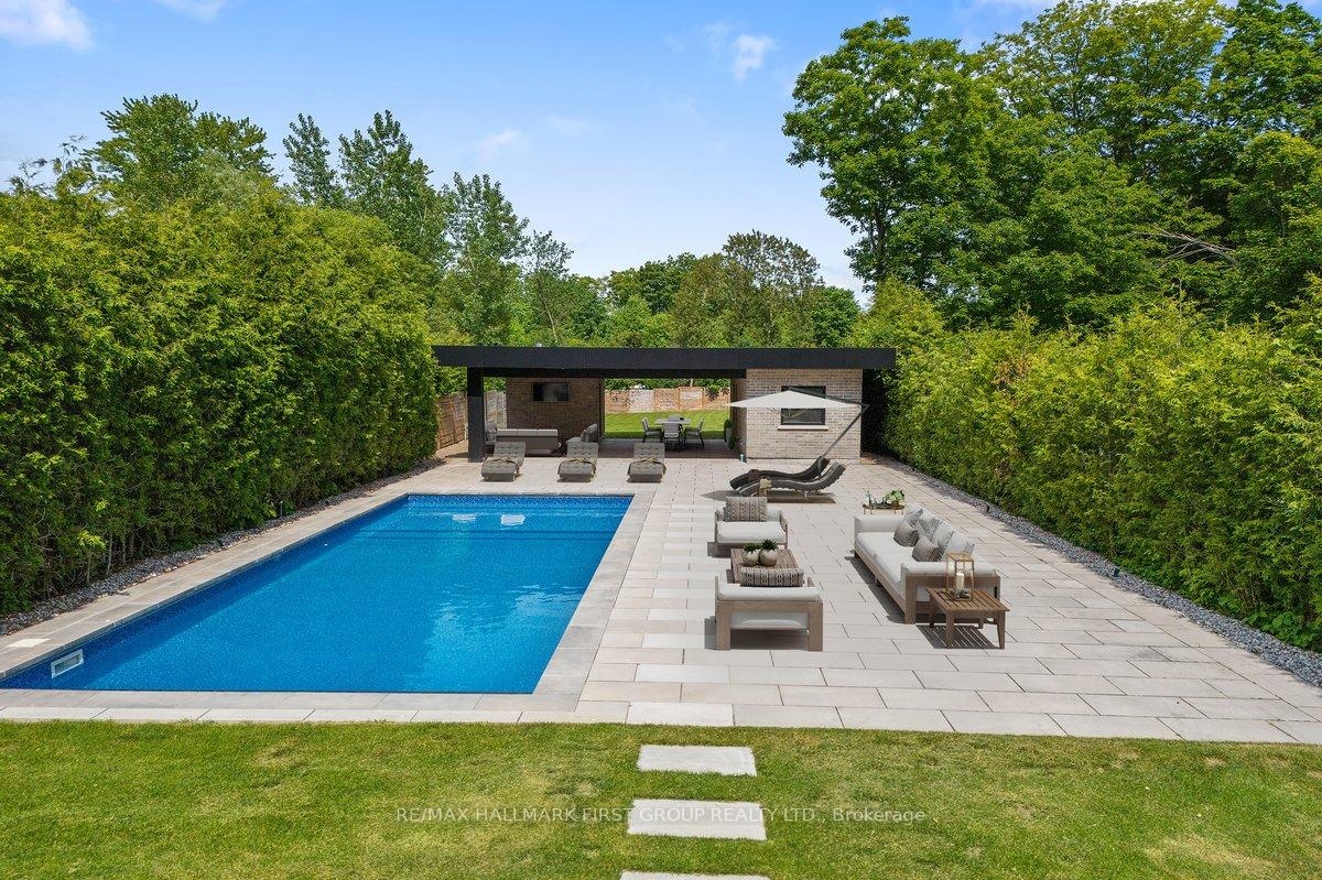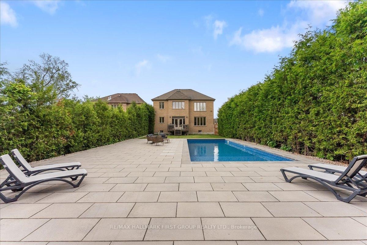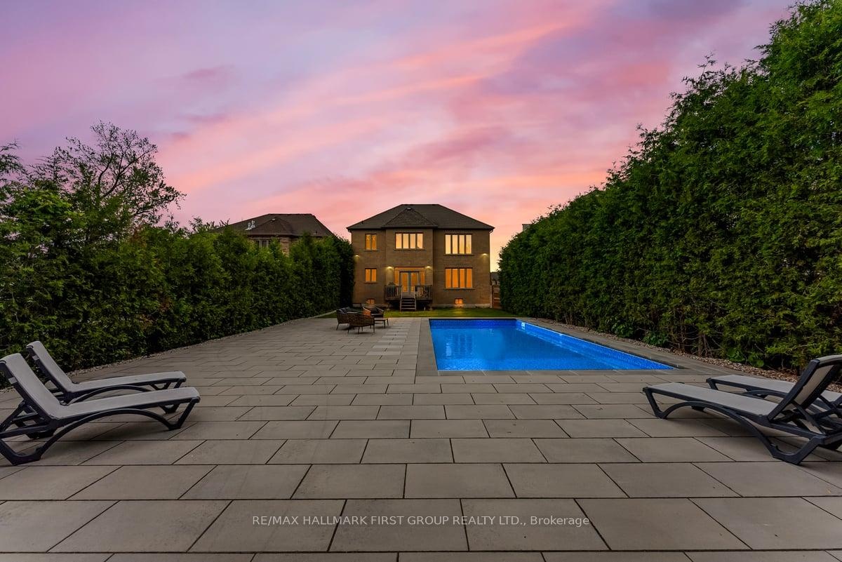 Welcome to this spectacular custom executive home, nestled on a RARE 374FT DEEP PREMIUM LOT offering ultimate privacy and serenity. Surrounded by trees and fully fenced, the professionally landscaped backyard is a true oasis featuring over $200K in recent upgrades. Enjoy resort style living with an INGROUND SALTWATER POOL with automatic cover, expansive patio, and stunning covered cabana with pot lights and gas lines ready for your firepit and BBQ. Whether you're entertaining guests or enjoying a quiet evening outdoors, the large grassy area and ambient lighting create the perfect setting. Inside, enjoy luxury finishes throughout, including hardwood floors, smooth ceilings with elegant crown moulding, pot lights, and generously sized rooms. The gourmet eat-in kitchen boasts stainless steel appliances, a center island with breakfast bar, a butlers pantry with prep sink, walk-in closet, and ample storage. The great room features soaring ceilings, and the main floor includes a private office. Upstairs, the primary suite offers double-door entry, vaulted ceilings, a 6-piece spa-like ensuite, and his/her walk-in closets. Oversized secondary bedrooms come with ensuites or semi-ensuites. Additional highlights include a balcony library/piano room and an unspoiled basement ready for your personal touch! With a spacious double car garage and third tandem spot, this home truly has it all - just minutes to the 401, the GO Station, shopping, restaurants, schools, and parks.