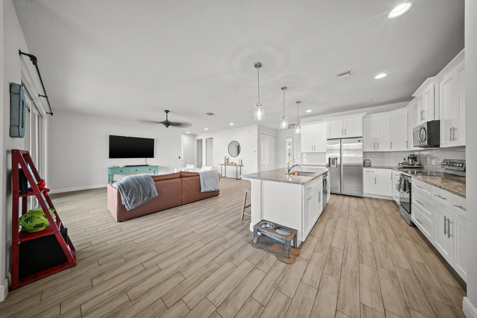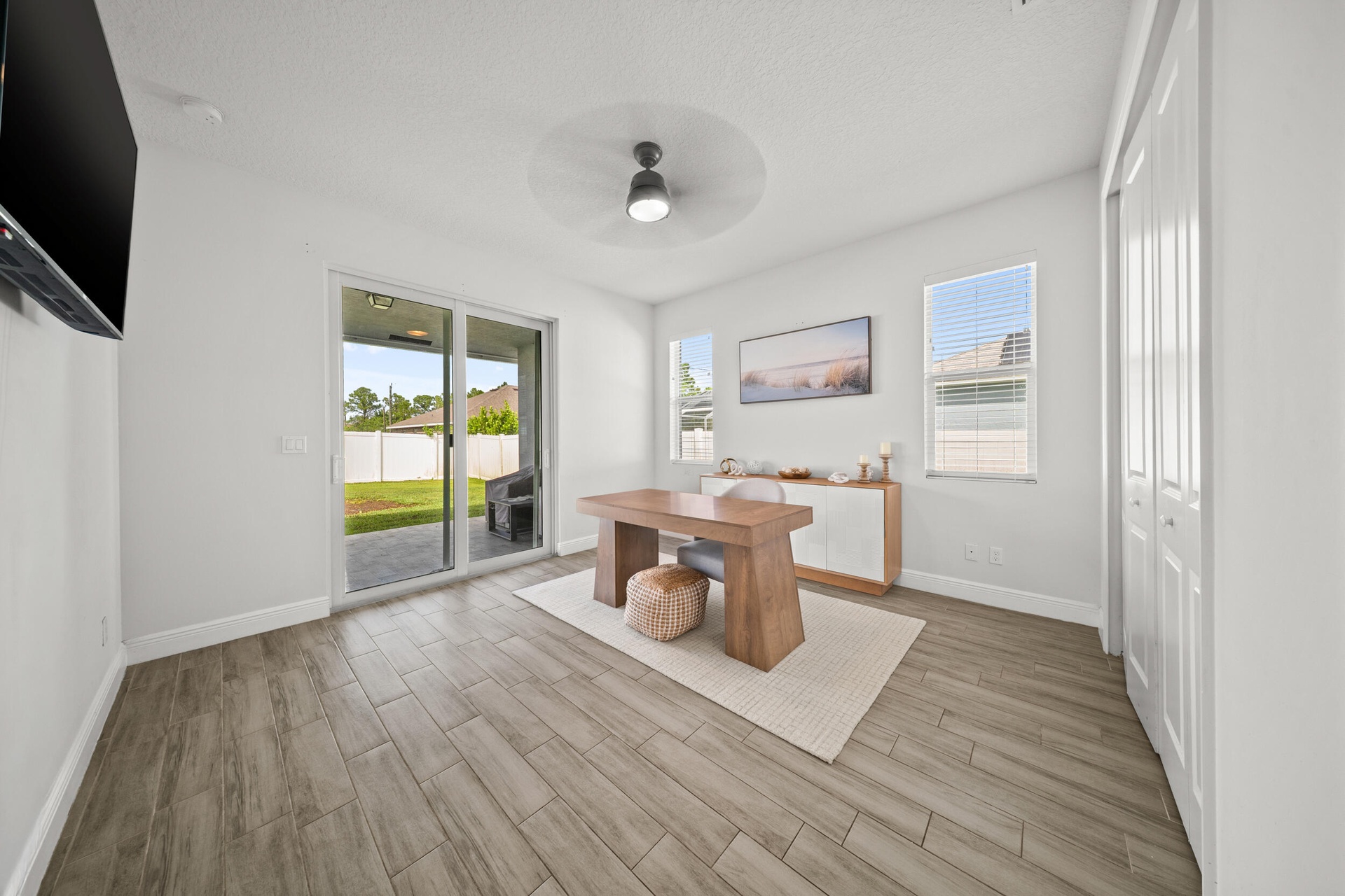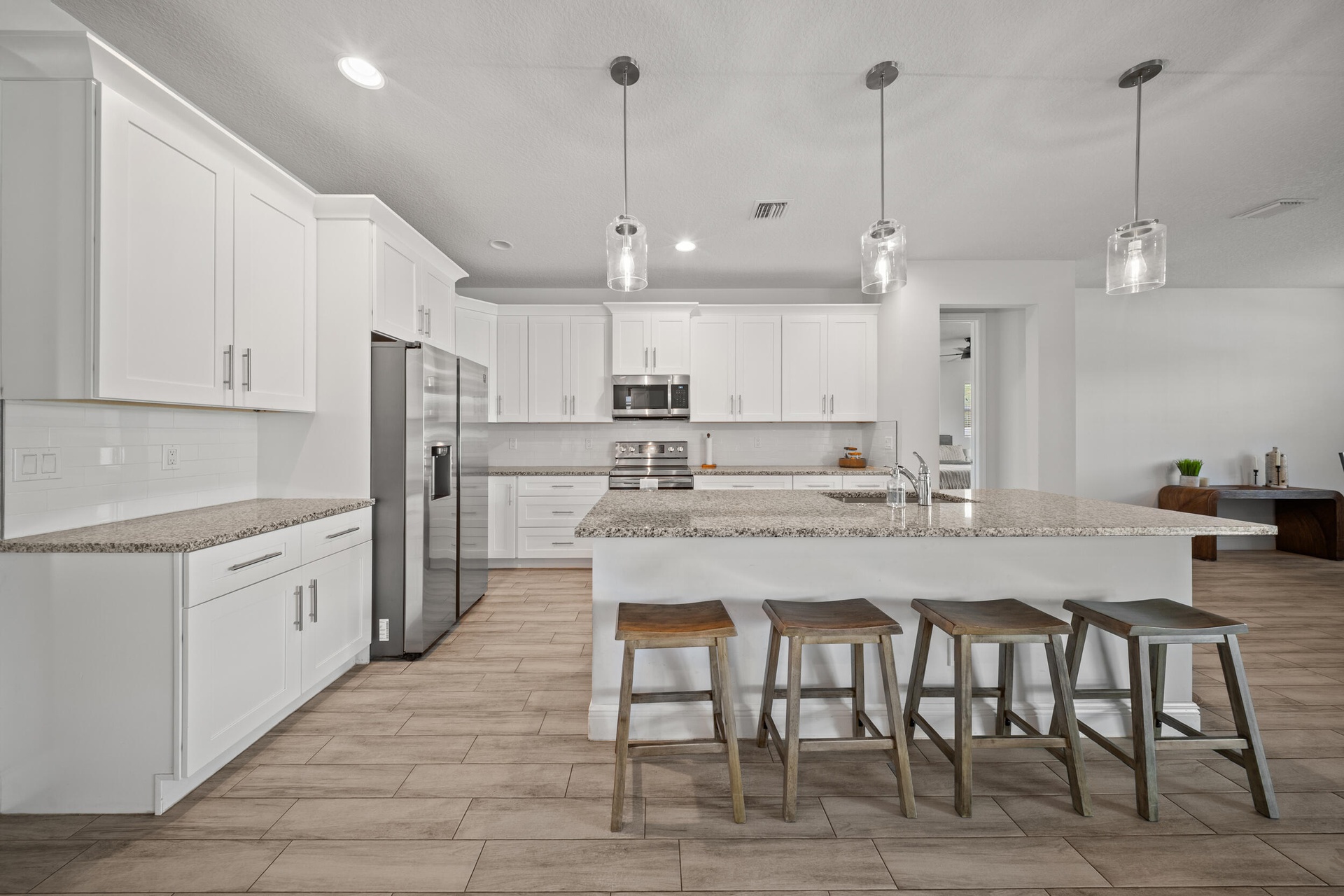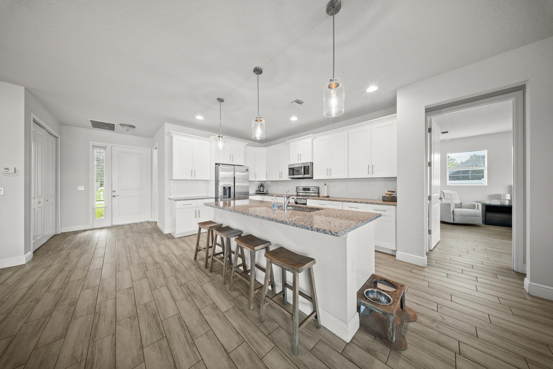 Welcome to 2437 SW Santana Ave, a stunning 4-bed, 2-bath home built in 2021 that blends style and comfort. Inside, you'll find gorgeous wood-look tile flooring throughout and a bright open-concept layout. The modern kitchen features granite countertops, stainless steel appliances, and plenty of cabinetry. The spacious primary suite offers two walk-in closet, sleek contemporary bathroom, and sliders leading to the fully fenced backyard with crisp white vinyl fencing and gutters--perfect for privacy and pets. Both bathrooms showcase clean, modern finishes, while the oversized laundry room includes cabinetry, a wash sink, and a countertop for folding. Move-in ready and thoughtfully designed!
