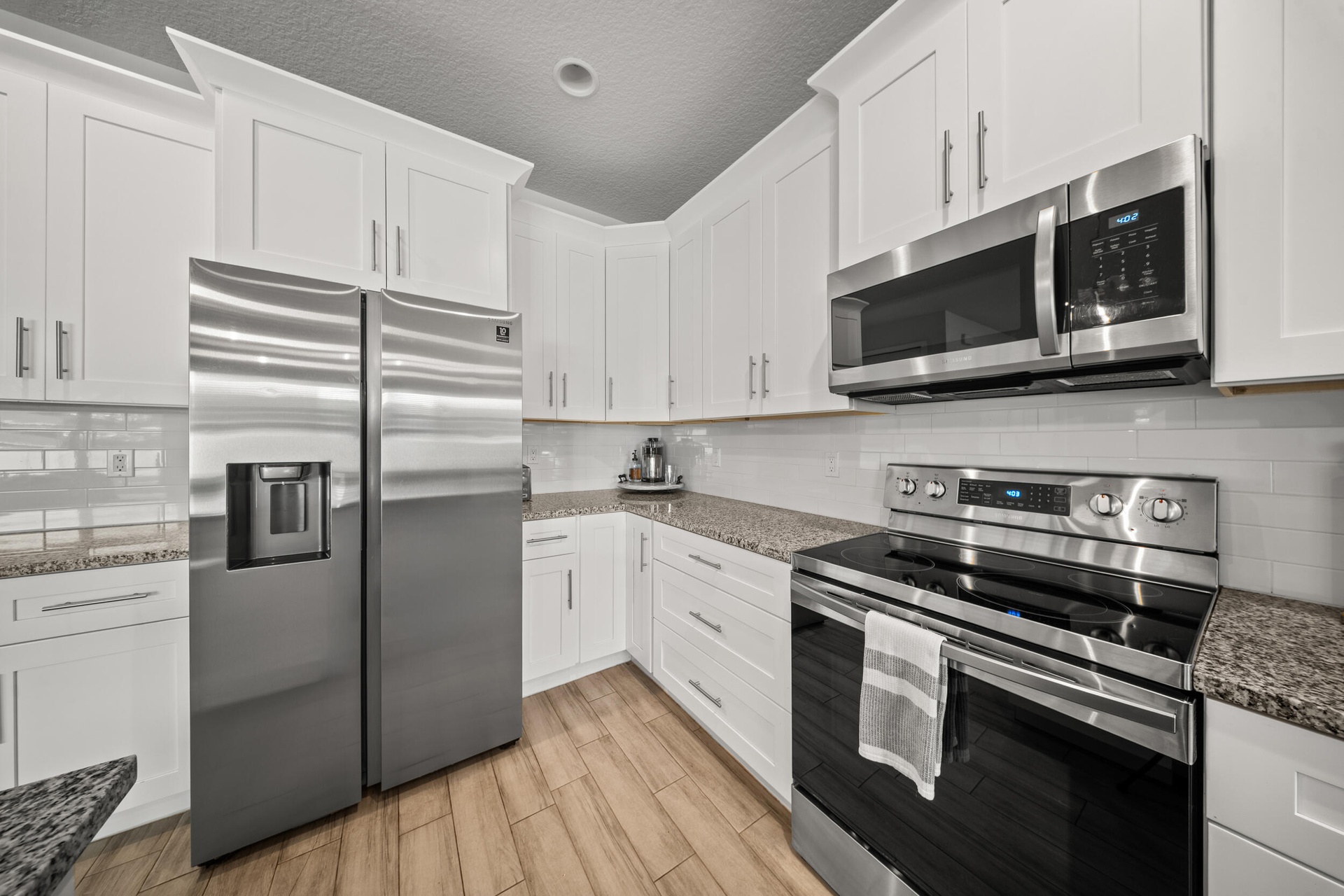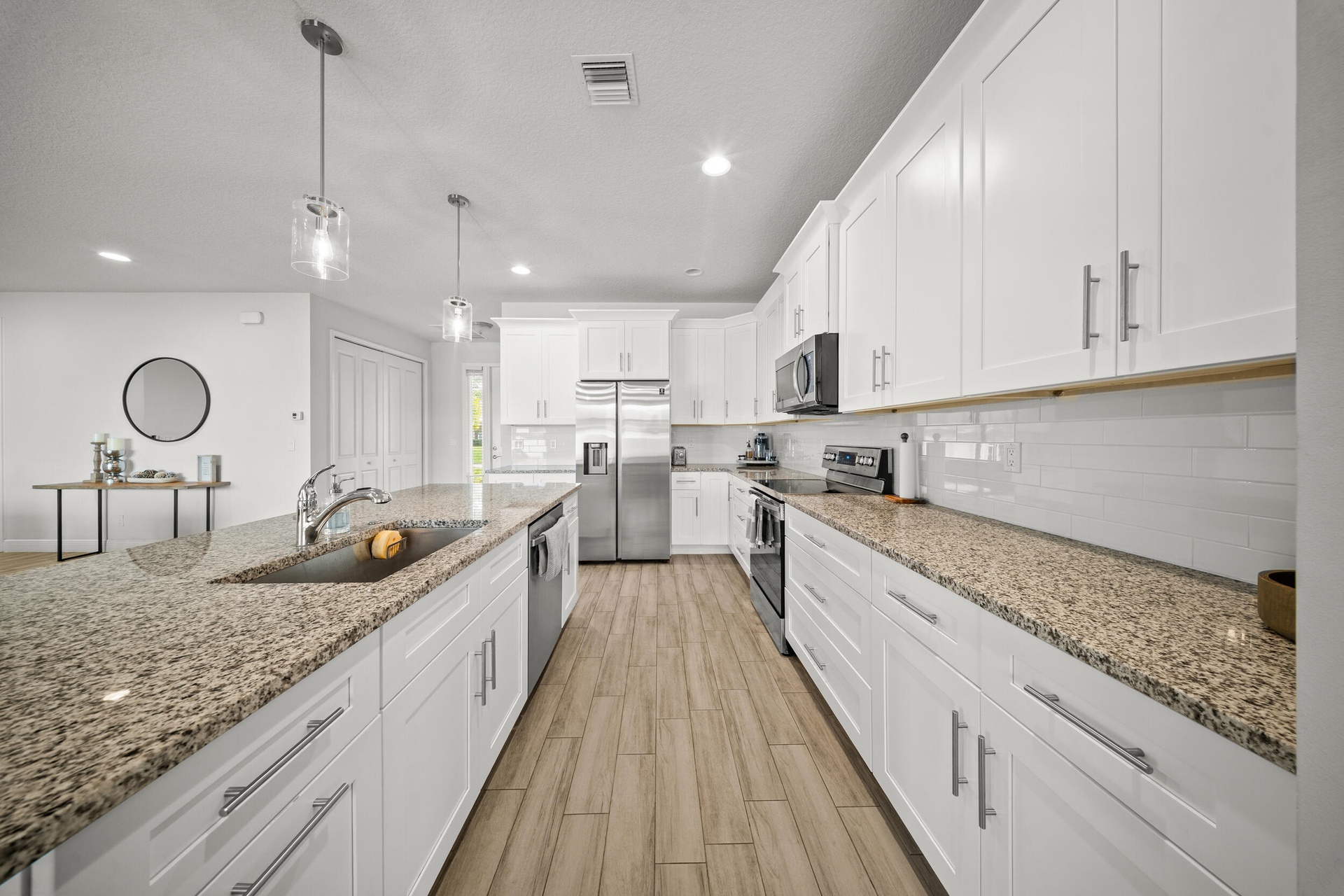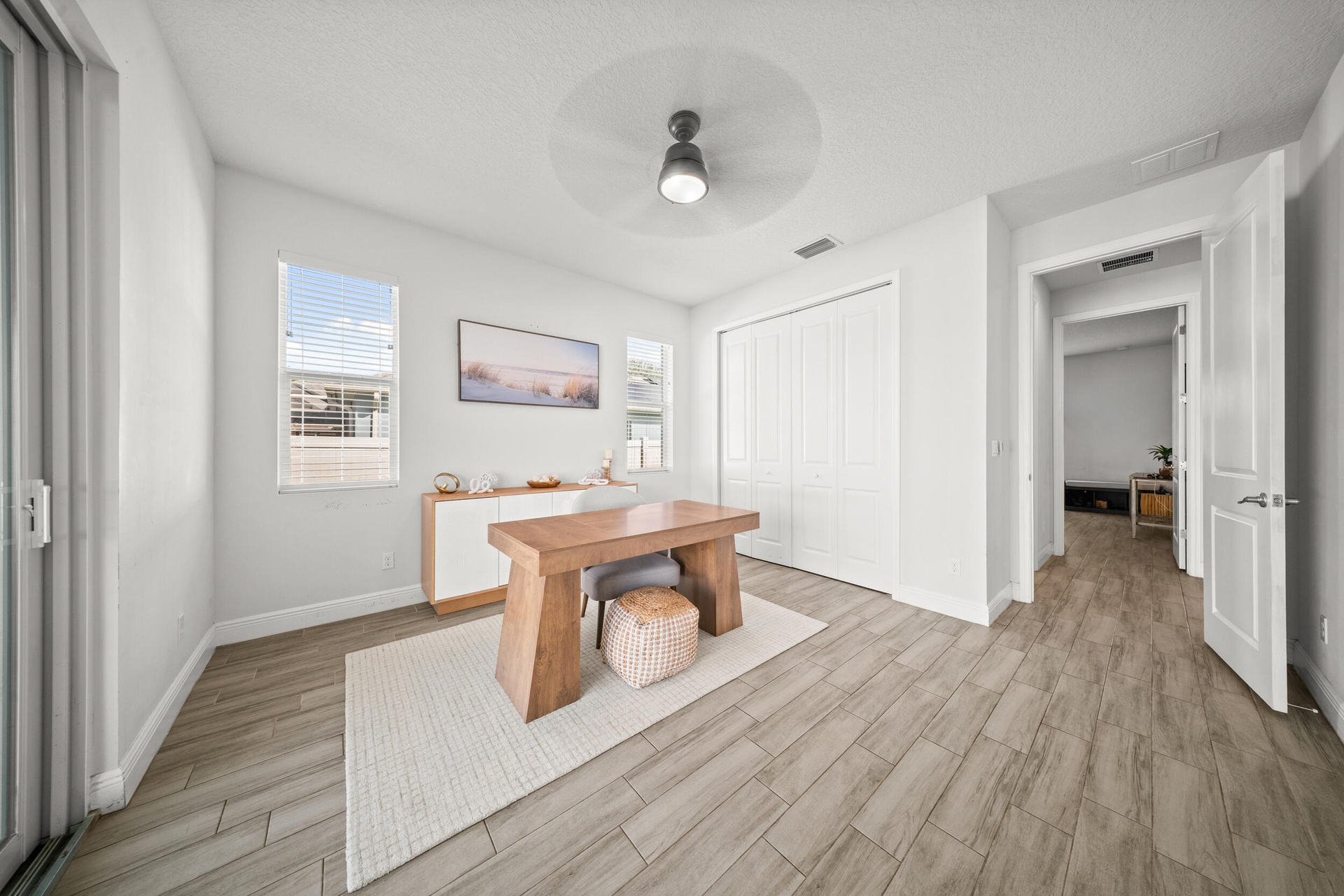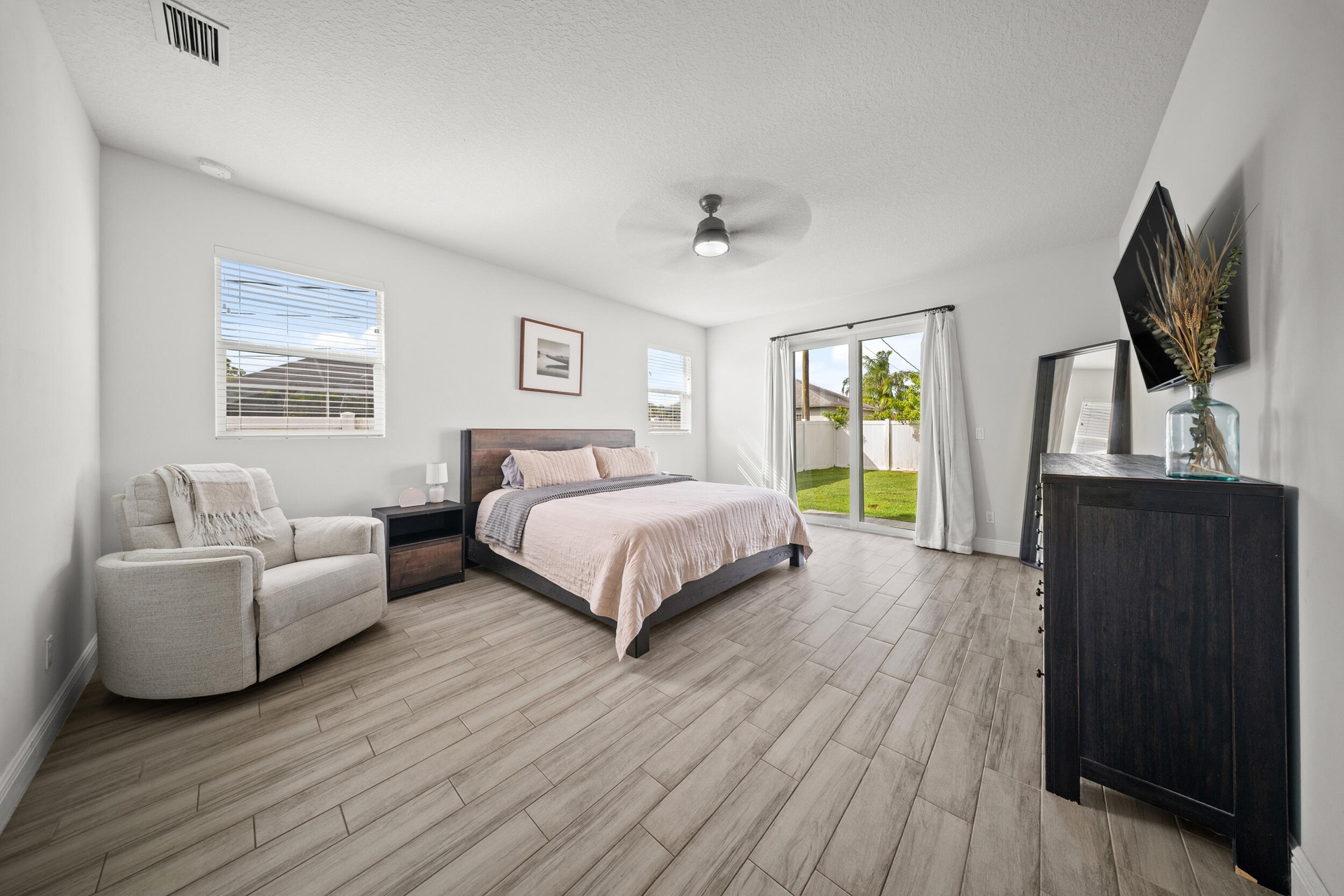 Welcome to 2437 SW Santana Ave, a stunning 4-bed, 2-bath home built in 2021 that blends style and comfort. Inside, you'll find gorgeous wood-look tile flooring throughout and a bright open-concept layout. The modern kitchen features granite countertops, stainless steel appliances, and plenty of cabinetry. The spacious primary suite offers two walk-in closet, sleek contemporary bathroom, and sliders leading to the fully fenced backyard with crisp white vinyl fencing and gutters--perfect for privacy and pets. Both bathrooms showcase clean, modern finishes, while the oversized laundry room includes cabinetry, a wash sink, and a countertop for folding. Move-in ready and thoughtfully designed!