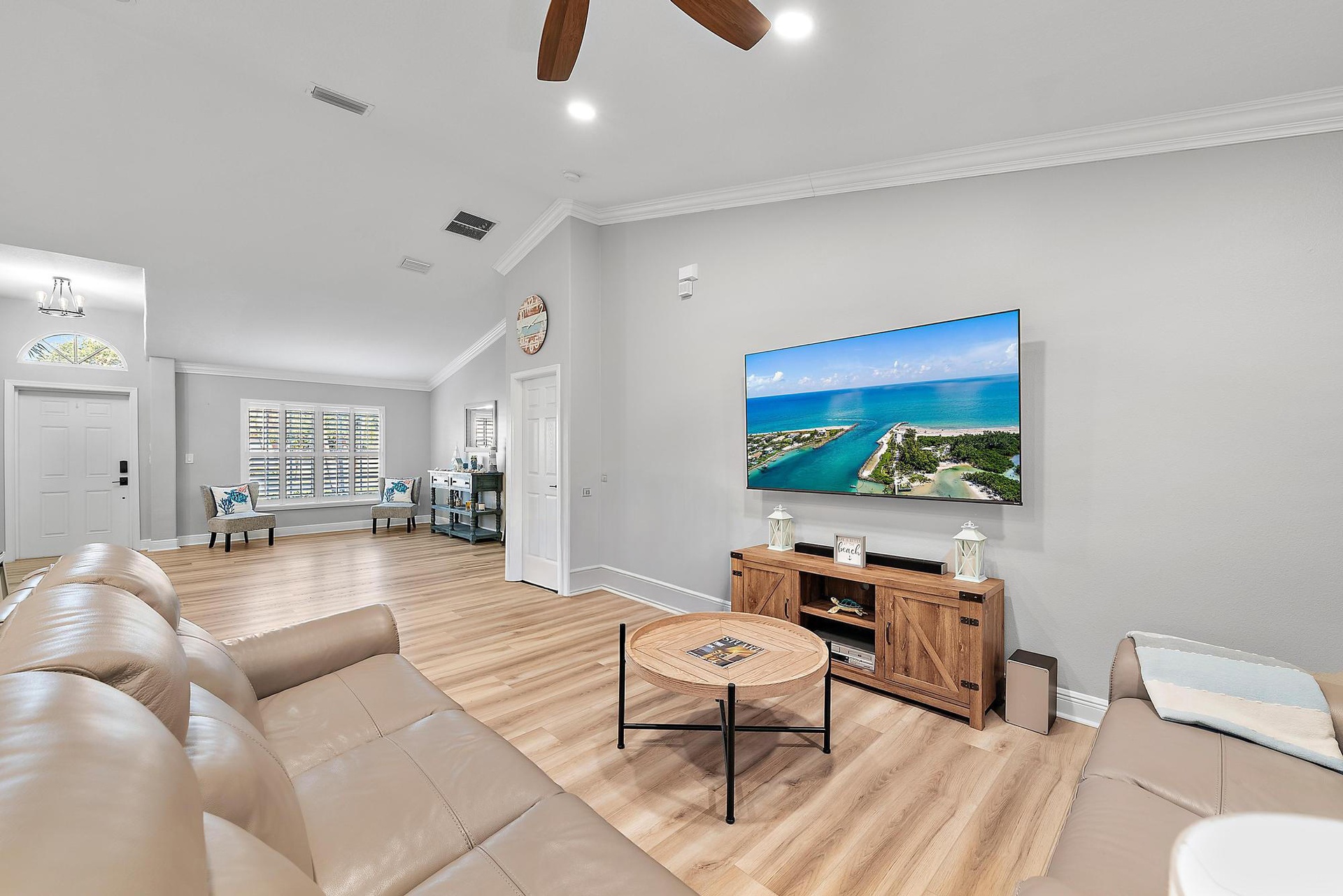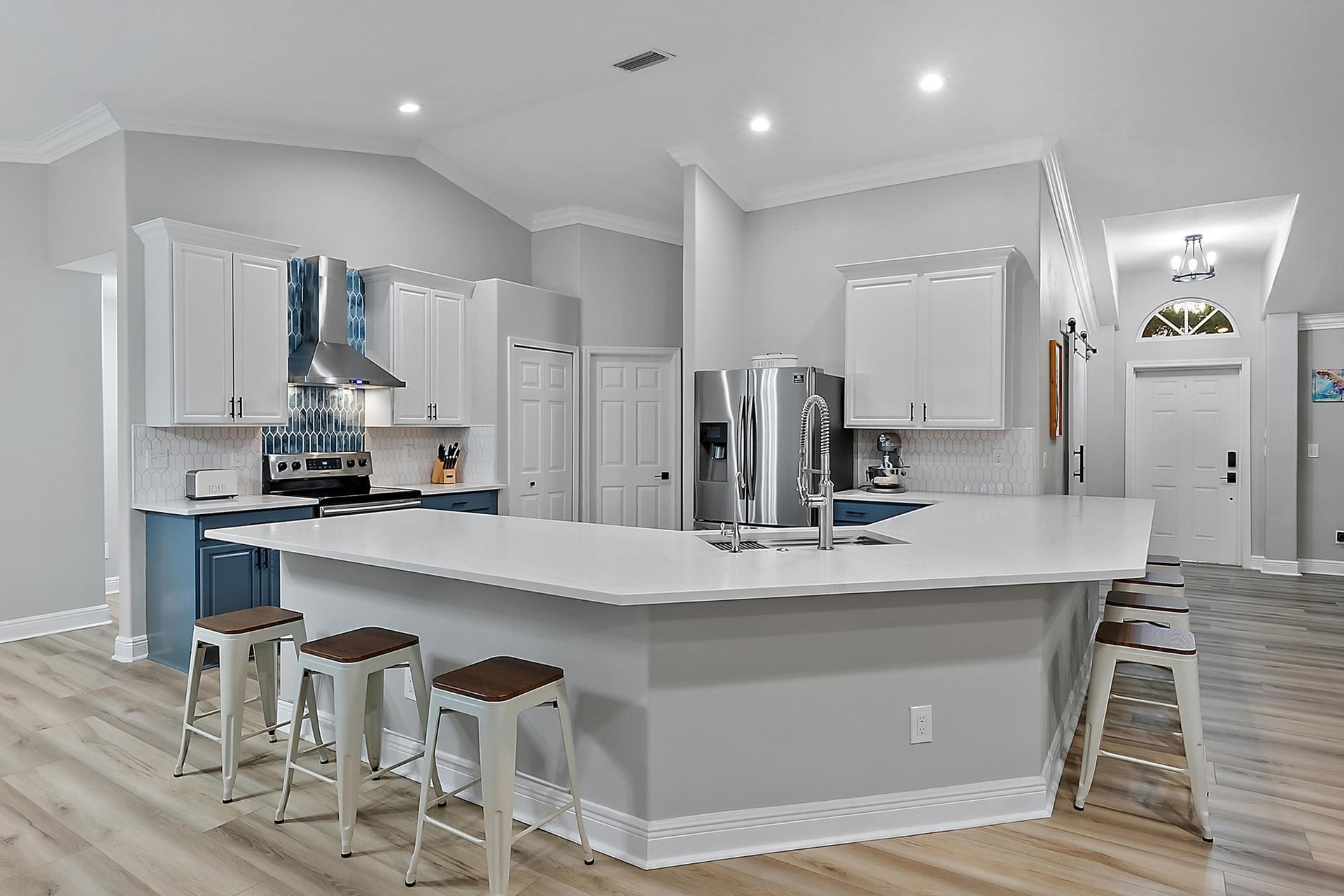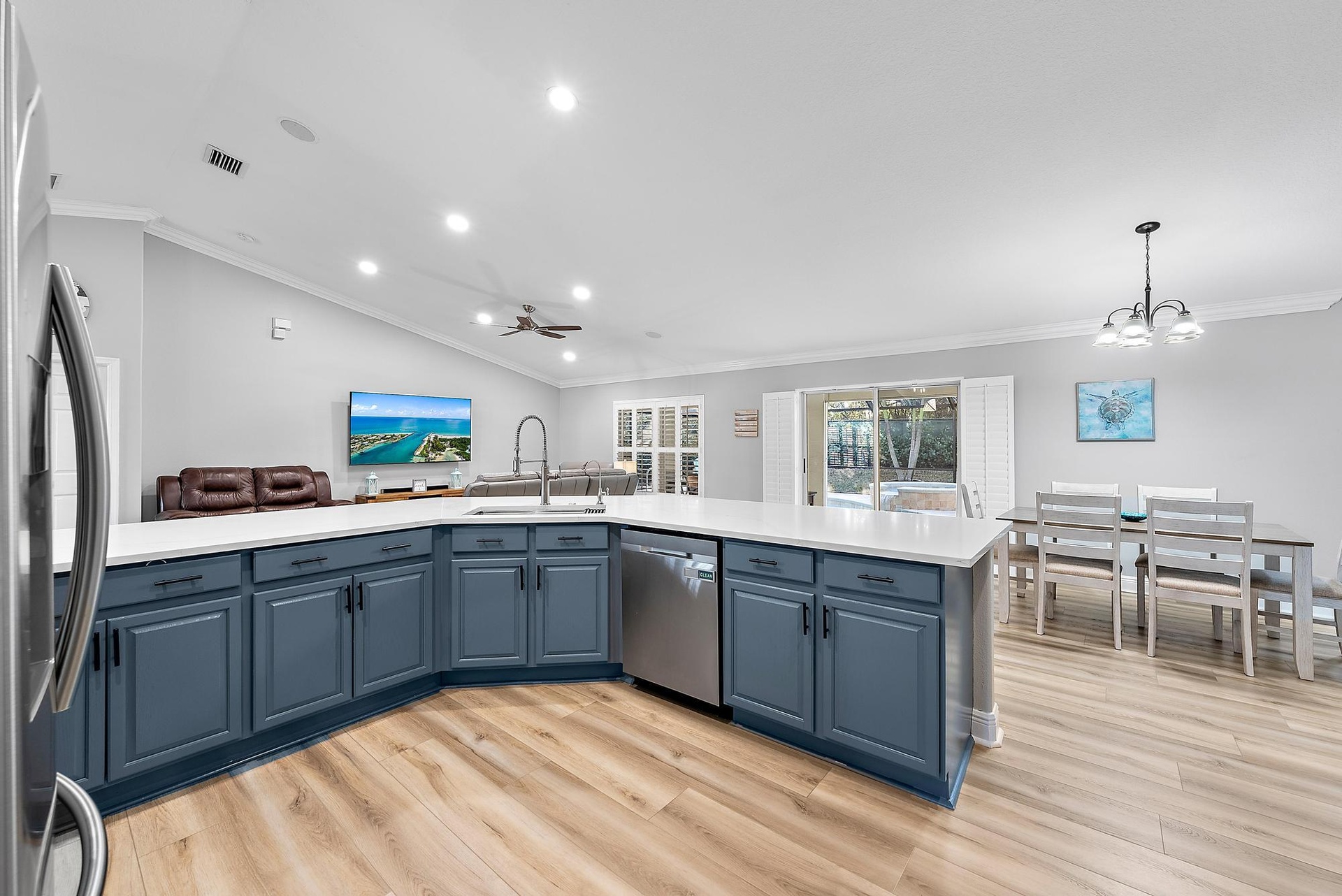 DescriptionA Rare Find! This 5-bedroom, 3-bath home stands out with thoughtful upgrades, a spacious open design, and a quarter-acre lot that offers room to live and entertain in comfort.Step inside to discover a beautifully renovated interior with an open floor plan and brand-new luxury vinyl plank flooring throughout. The gourmet kitchen boasts sleek Samsung appliances, a spacious stainless steel sink with reverse osmosis filtration, and expansive quartz countertops. A stylish butler's pantry with butcher block counters adds both function and charm.The main level offers four bedrooms and two full baths, including a convenient cabana bath with private access to the patio and pool. The primary suite also opens directly to the outdoor living space.