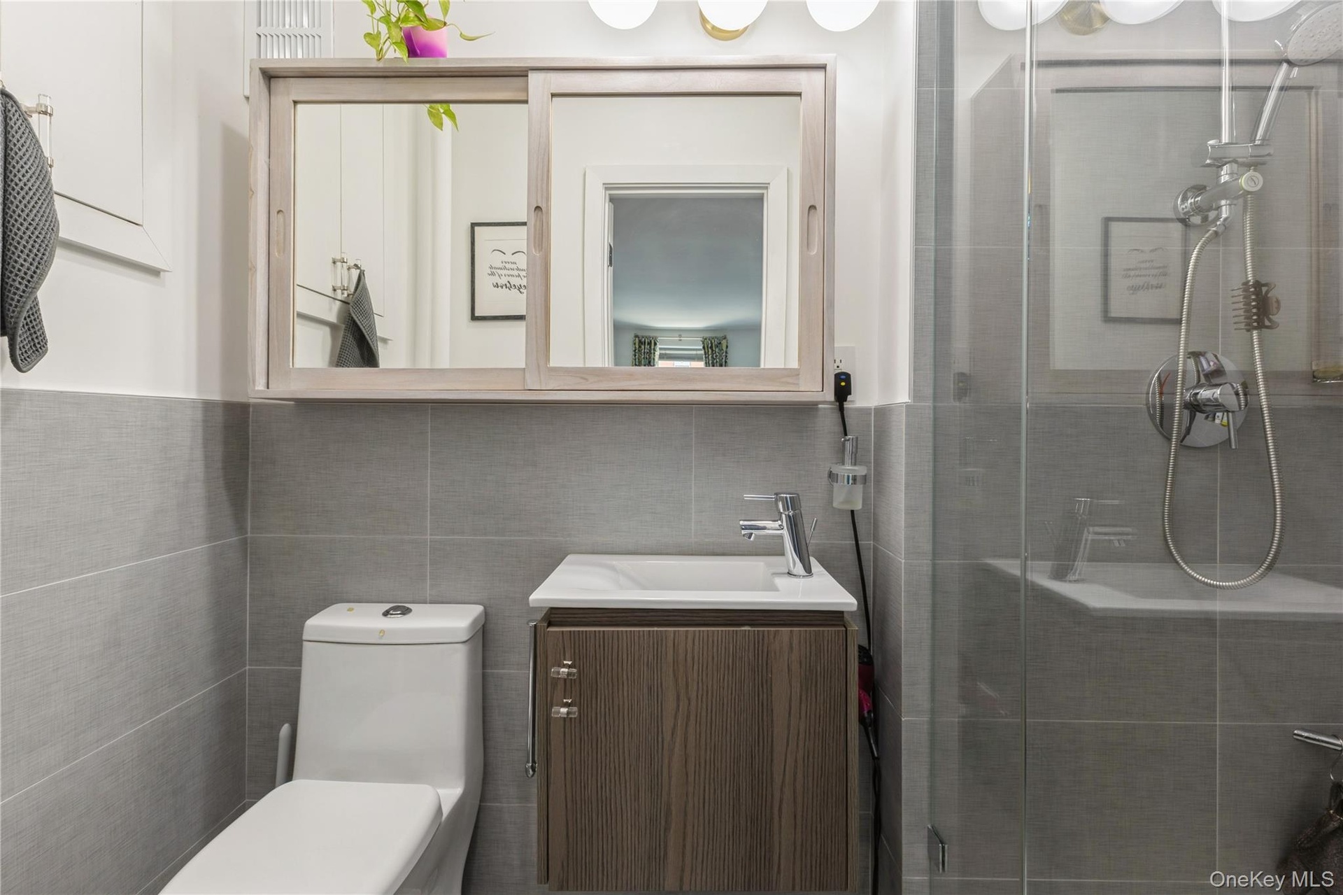 - Full bathroom featuring tile walls, a stall shower, and vanity