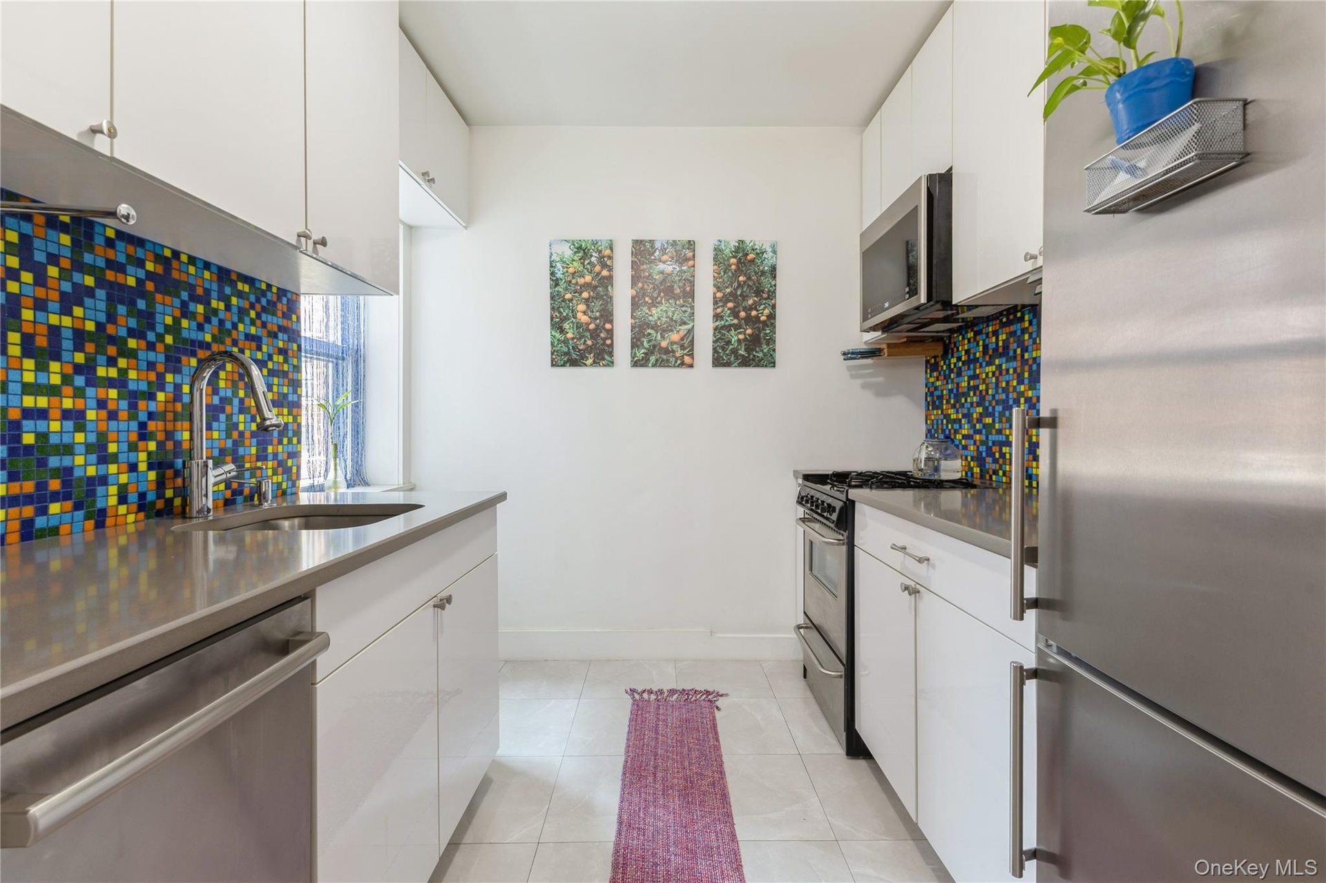 - Kitchen with backsplash, white cabinetry, light tile patterned floors, stainless steel appliances, and decorative light fixtures