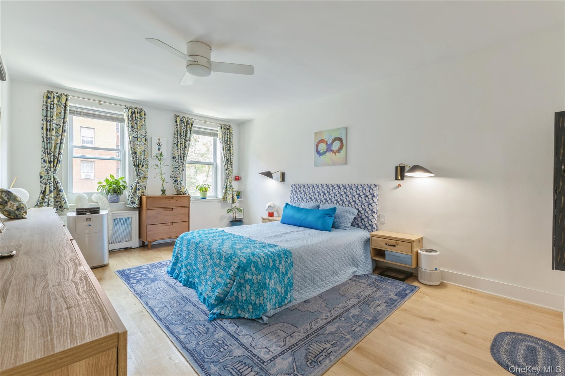 - Bedroom with light wood finished floors, a ceiling fan, and radiator