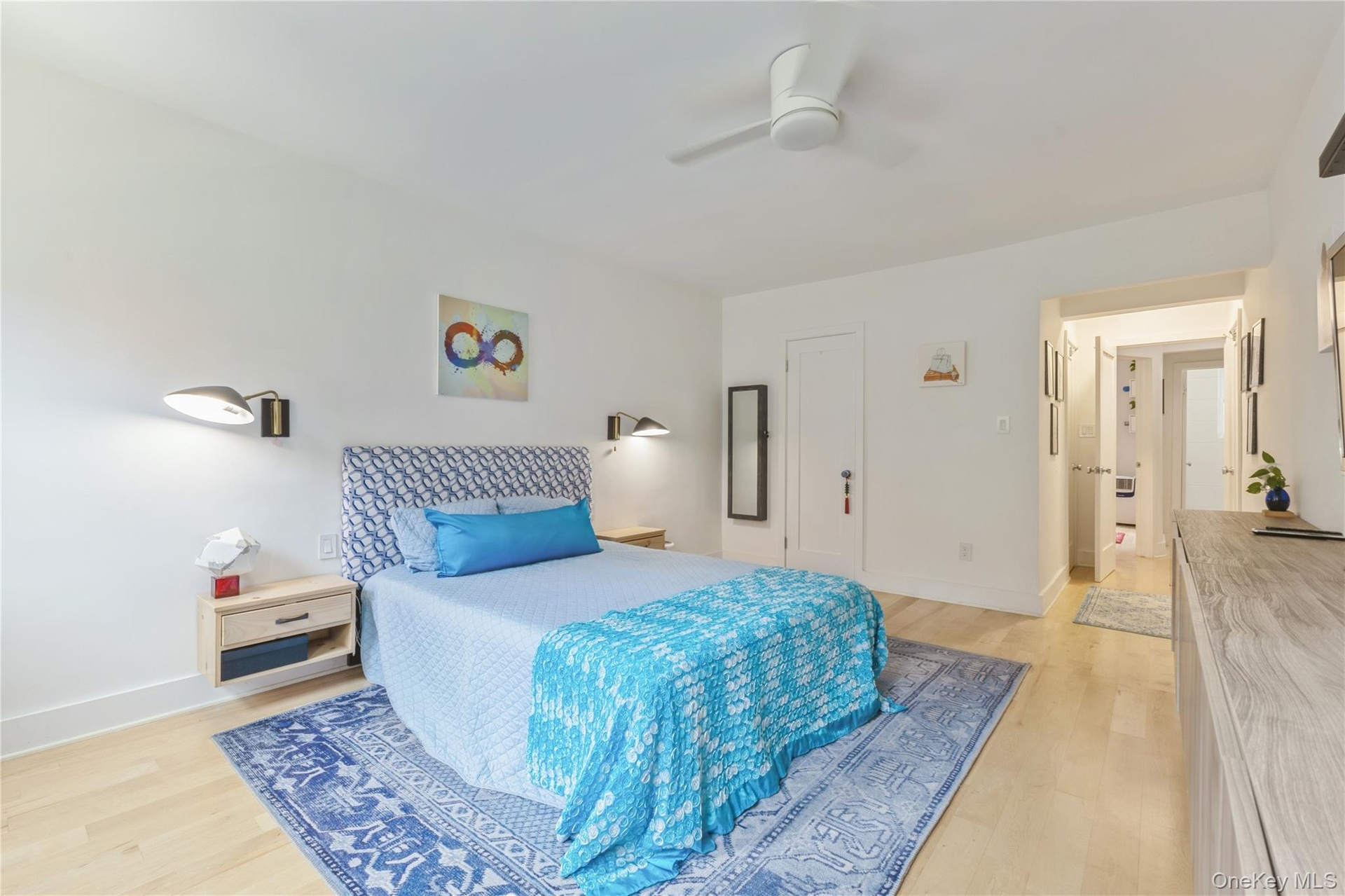 - Bedroom with light wood-type flooring, a ceiling fan, and a closet
