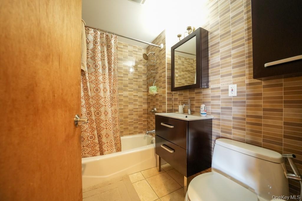 - Full bath featuring toilet, shower / tub combo, tile walls, tile patterned flooring, and vanity