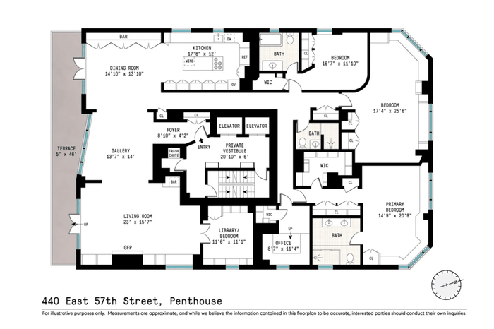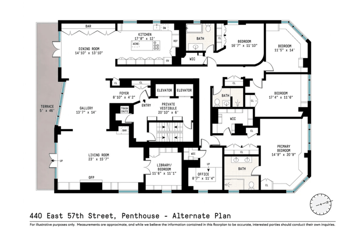 Step off of the elevator onto the private landing and enjoy the convenience of leaving your overcoat in the vestibule before entering this mint condition penthouse. With almost 3500 sq ft indoors and more than 200 sq ft of terrace, this top-floor residence enjoys North, East, South and West exposures. Currently configured as a 4 bedroom (one is a Library), it easily converts to 5 if desired (see alternate floorplan).