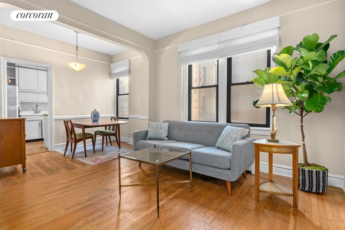 Step into the spacious 26-foot living and dining area, filled with natural light streaming through large windows. There's plenty of room here to configure a layout that suits your lifestyle. The classic pre-war design ensures timeless elegance, while the windowed kitchen offers ample cabinetry, ready to be customized to your preferences.