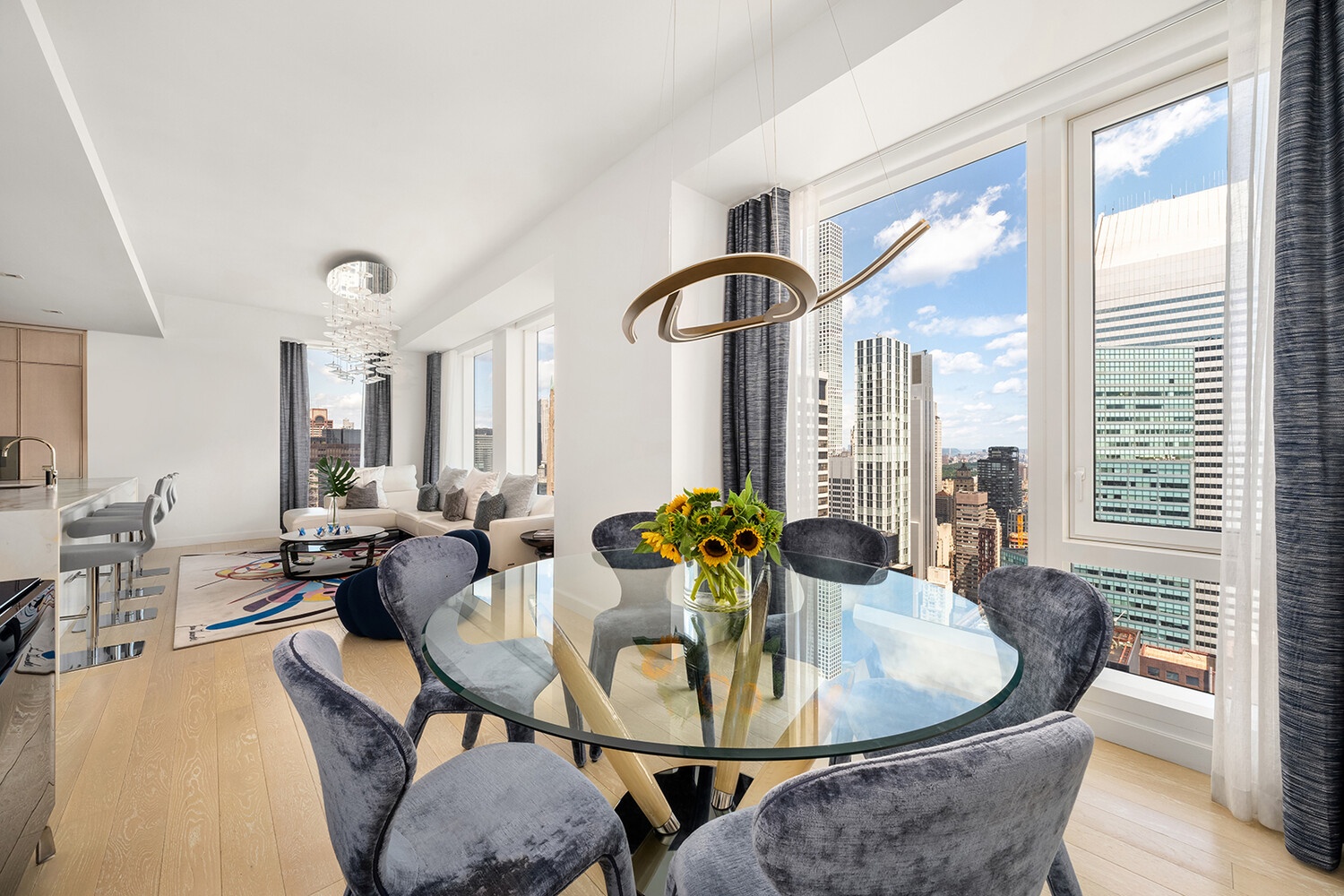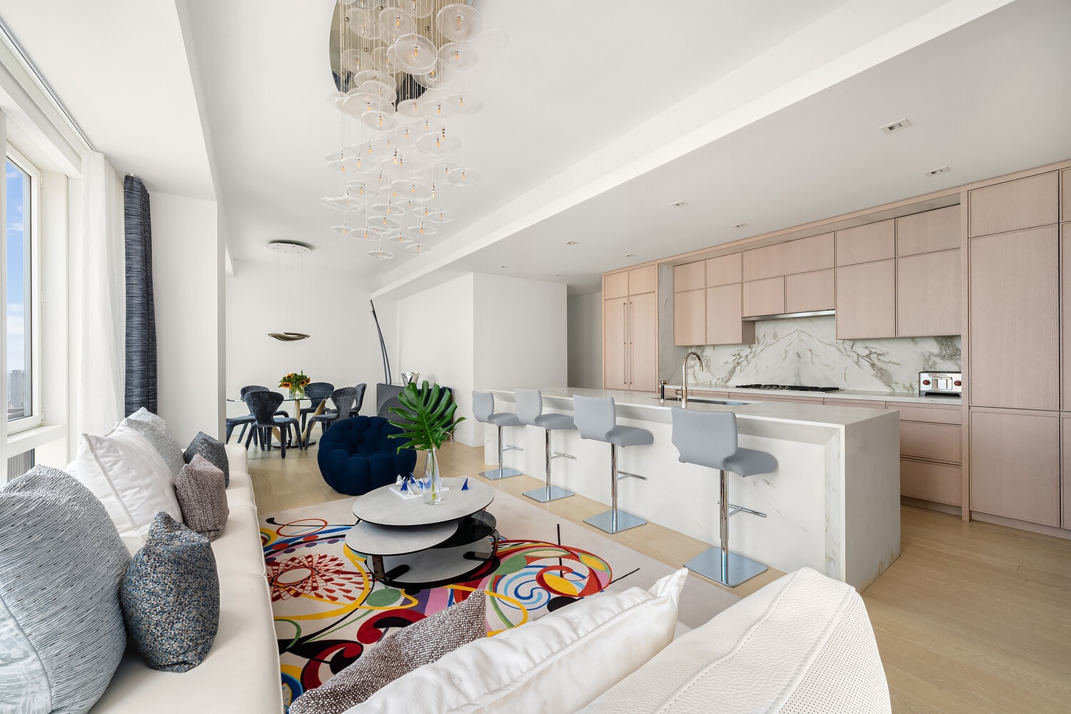Expansive two bedroom, two and a half bathroom residence with Postcard views designed by Champalimaud offering north, west and southern exposures through floor-to-ceiling windows on the 53rd Floor. White oak flooring throughout leads from the entry into an open living and dining concept, complete with a chef's kitchen offering honed Capri marble countertops, backsplash, and a waterfall island with room for seating. The kitchen has a refined aesthetic with streamlined custom white oak millwork that seamlessly integrates a full Gaggenau appliance package, including an undercounter wine refrigerator, complemented by Dornbracht fixtures.