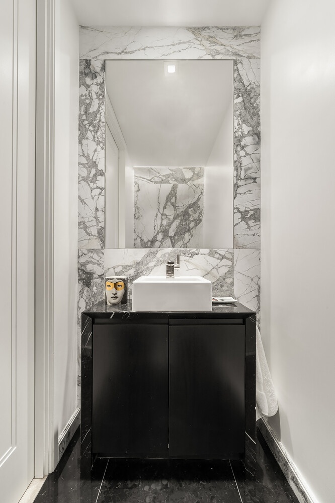 The master bedroom features an expansive walk-in closet and en-suite five fixture master bath. The serene master bath offers Bianco Dolomiti radiant heated flooring underfoot, an enclosed shower, and a separate Kohler tub with Marno Illusion marble details. A custom vanity with white oak, rift-cut wood veneer millwork, and Marno Illusion countertops is completed with a built-in medicine cabinet, Kallista Sink and Dornbracht Fixtures. A unique powder room features a dramatically veined Nero Maquina vanity countertop, ebony stained oak quarter cut wood veneer vanity and Nero Maquina floors. An eye-catching Cobalt Flash marble wet wall, Dornbracht fixtures and a Kohler Corbelle toilet offers a striking contrast against the dark woods and stones. A Nest Learning Thermostat and Bosch washer and dryer complete this elegant residence.