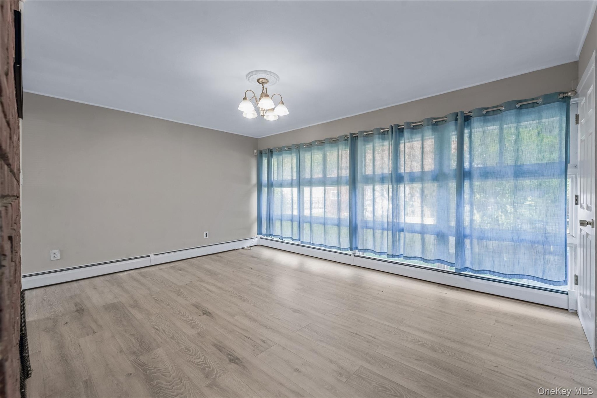 - Empty room featuring baseboard heating, light wood finished floors, and a chandelier
