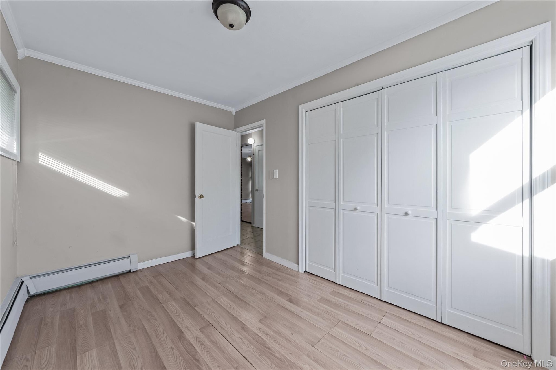 - Unfurnished bedroom with crown molding, light wood-style floors, a baseboard radiator, and a closet