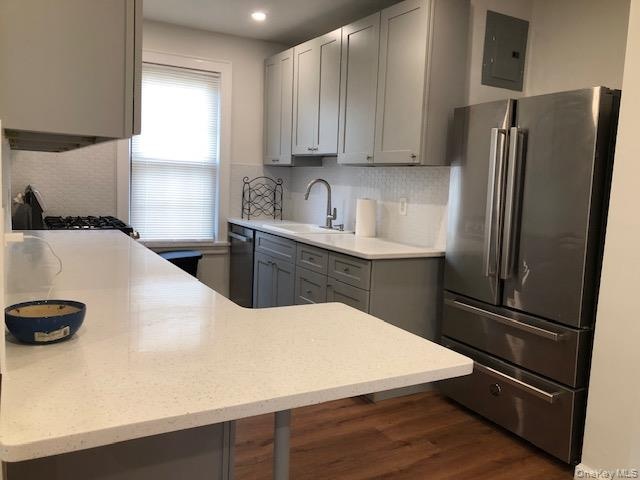 - Kitchen with stainless steel appliances, gray cabinets, electric panel, dark wood finished floors, and light stone countertops
