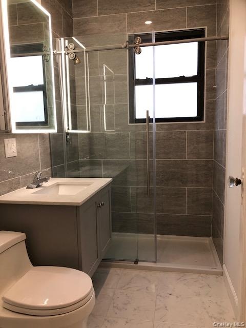 - Bathroom featuring vanity and a shower stall