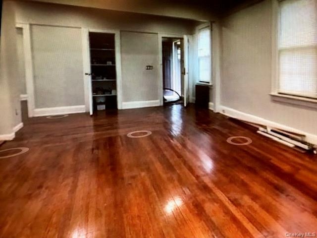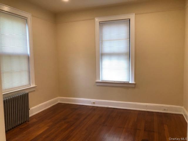 - Unfurnished room with radiator heating unit, dark wood finished floors, and healthy amount of natural light