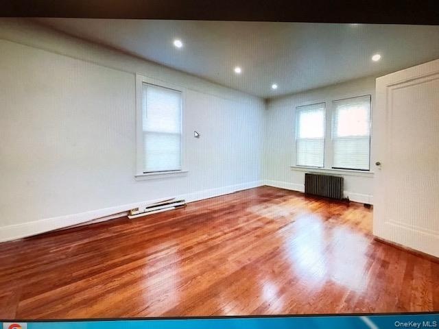 - Unfurnished room featuring wood finished floors, radiator heating unit, recessed lighting, and a baseboard heating unit