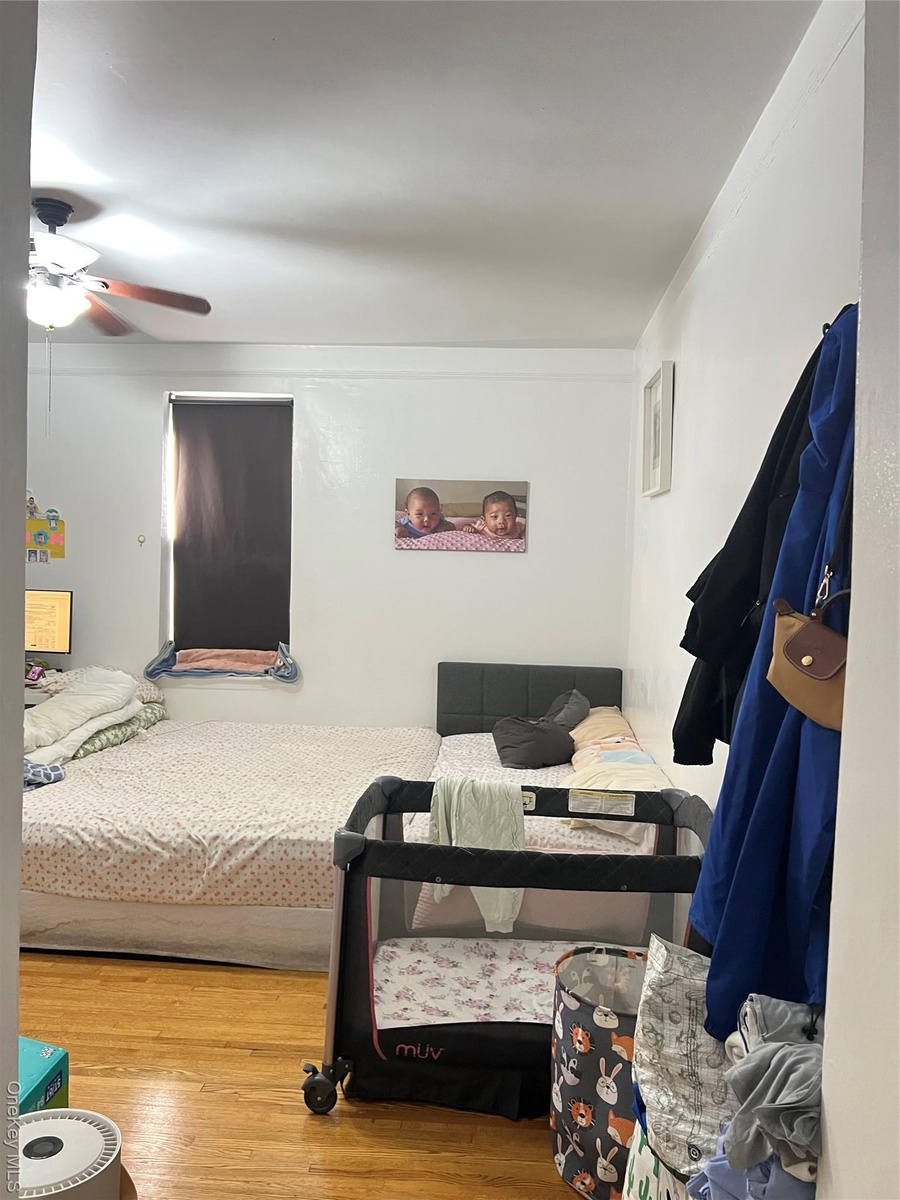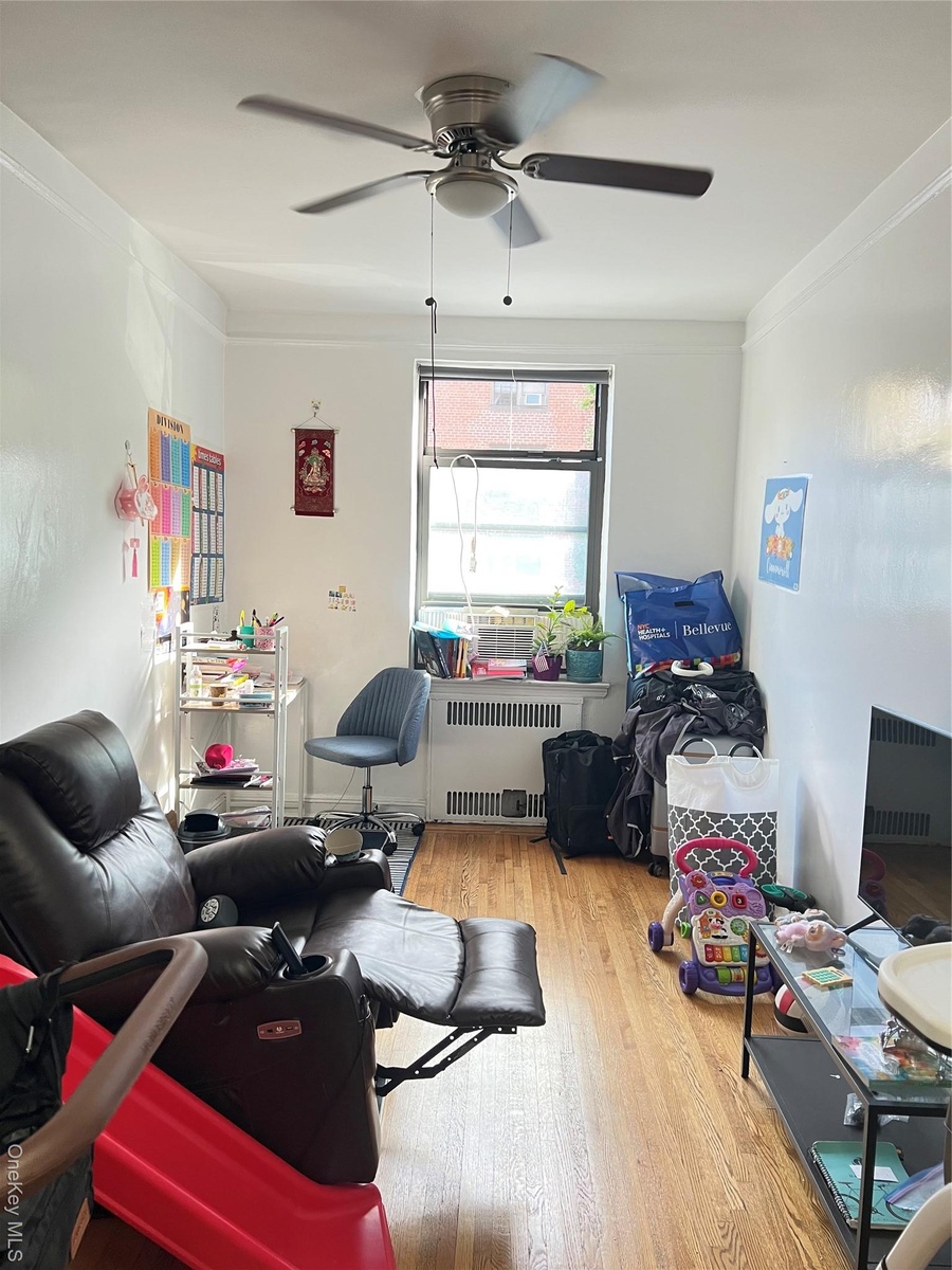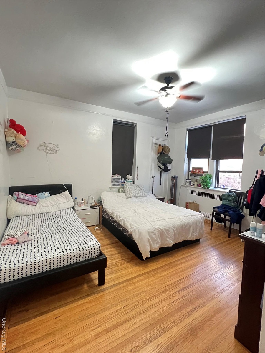 - Bedroom with light wood-type flooring, radiator, and a ceiling fan