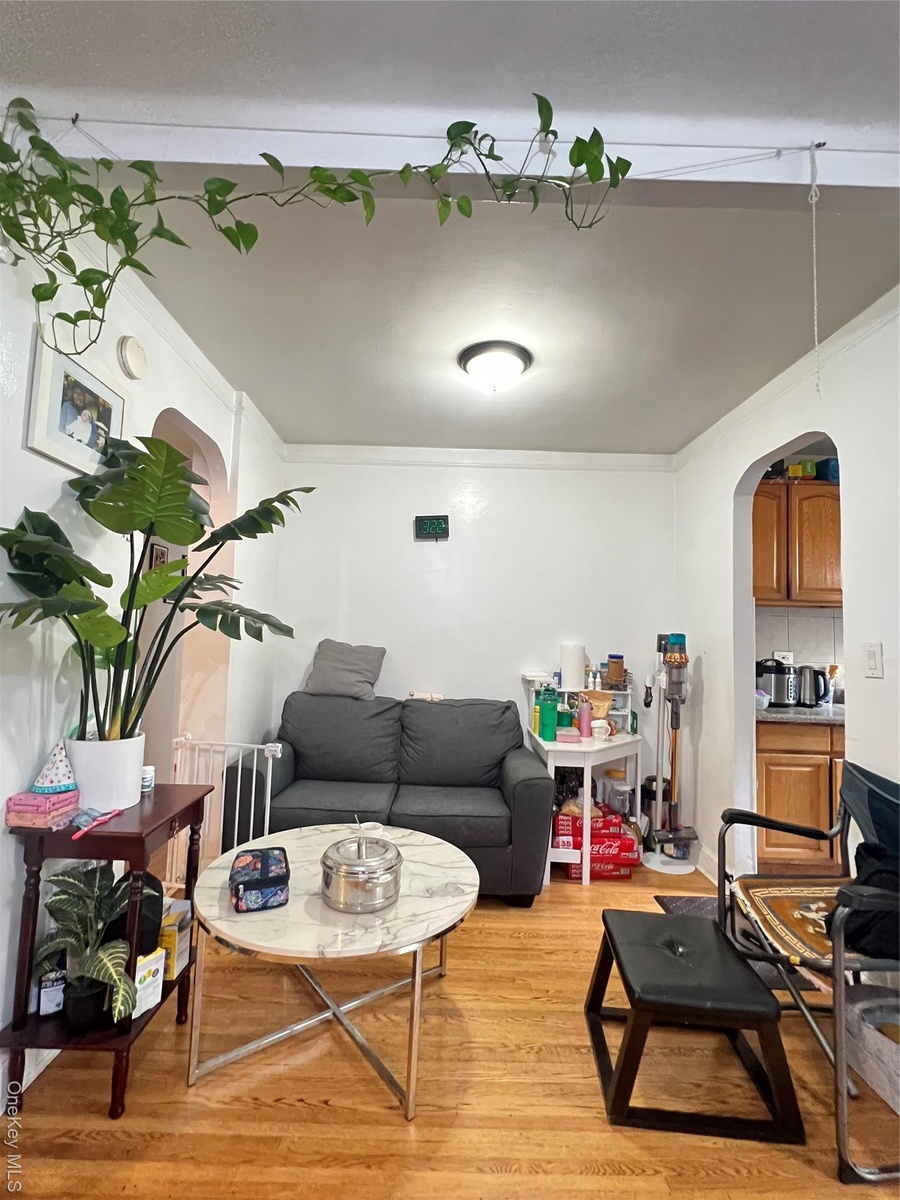 - Living room featuring arched walkways, light wood-type flooring, and ornamental molding