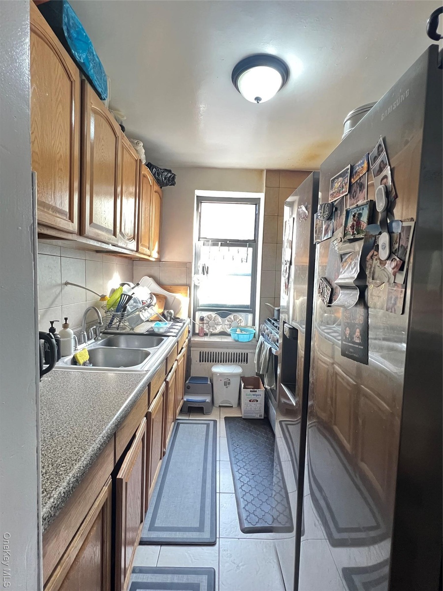 - Kitchen with fridge, light tile patterned floors, brown cabinets, radiator, and light countertops