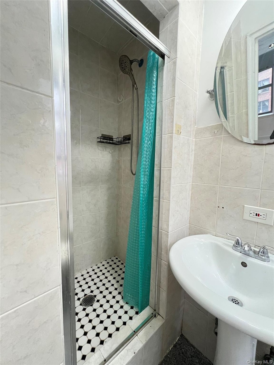 - Bathroom with a shower stall and tile walls