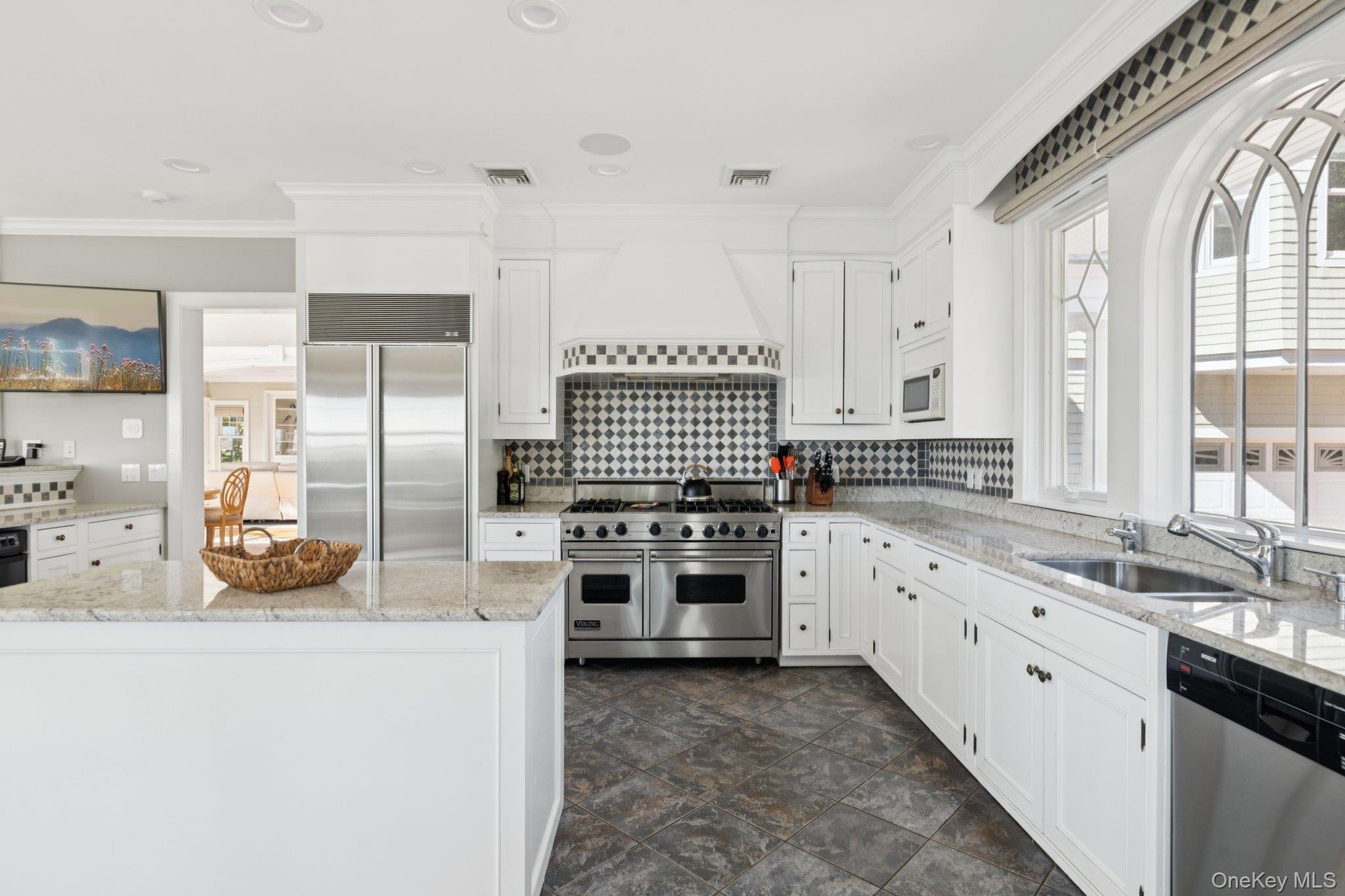 Inside, over 4,000 square feet of thoughtfully designed living space unfolds through a double-height foyer with coffered ceiling and floor-to-ceiling windows that frame panoramic water views. The open layout includes a spacious great room with a gas fireplace, formal and casual dining spaces, and a chef’s kitchen equipped with Viking and Sub-Zero appliances, dual dishwashers, double sinks, and counter seating for easy entertaining.