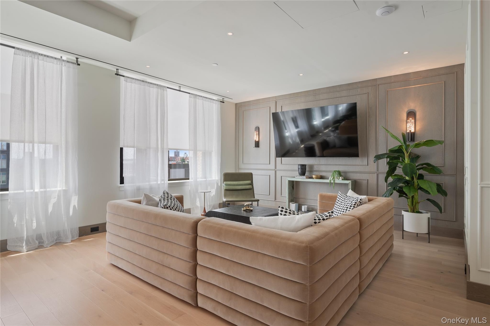 - Living area with a decorative wall, light wood-type flooring, and recessed lighting