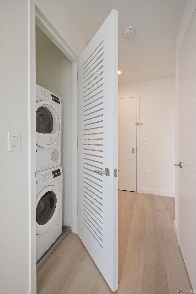 - Washroom with light wood-type flooring, stacked washer and clothes dryer, and recessed lighting