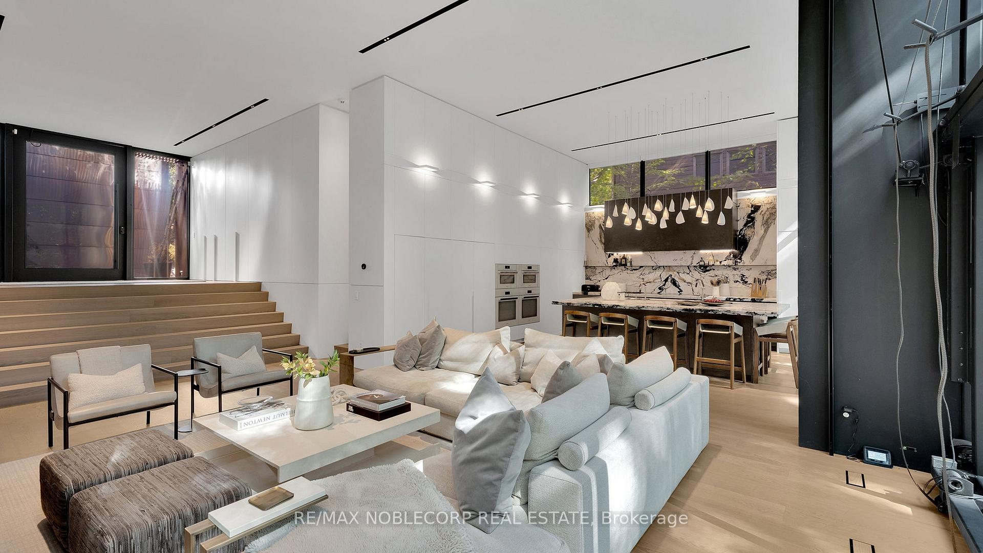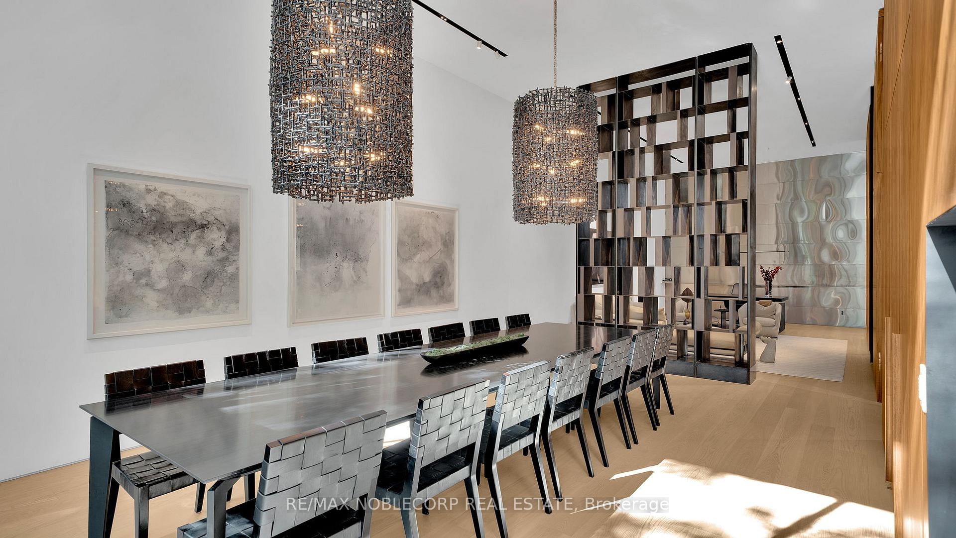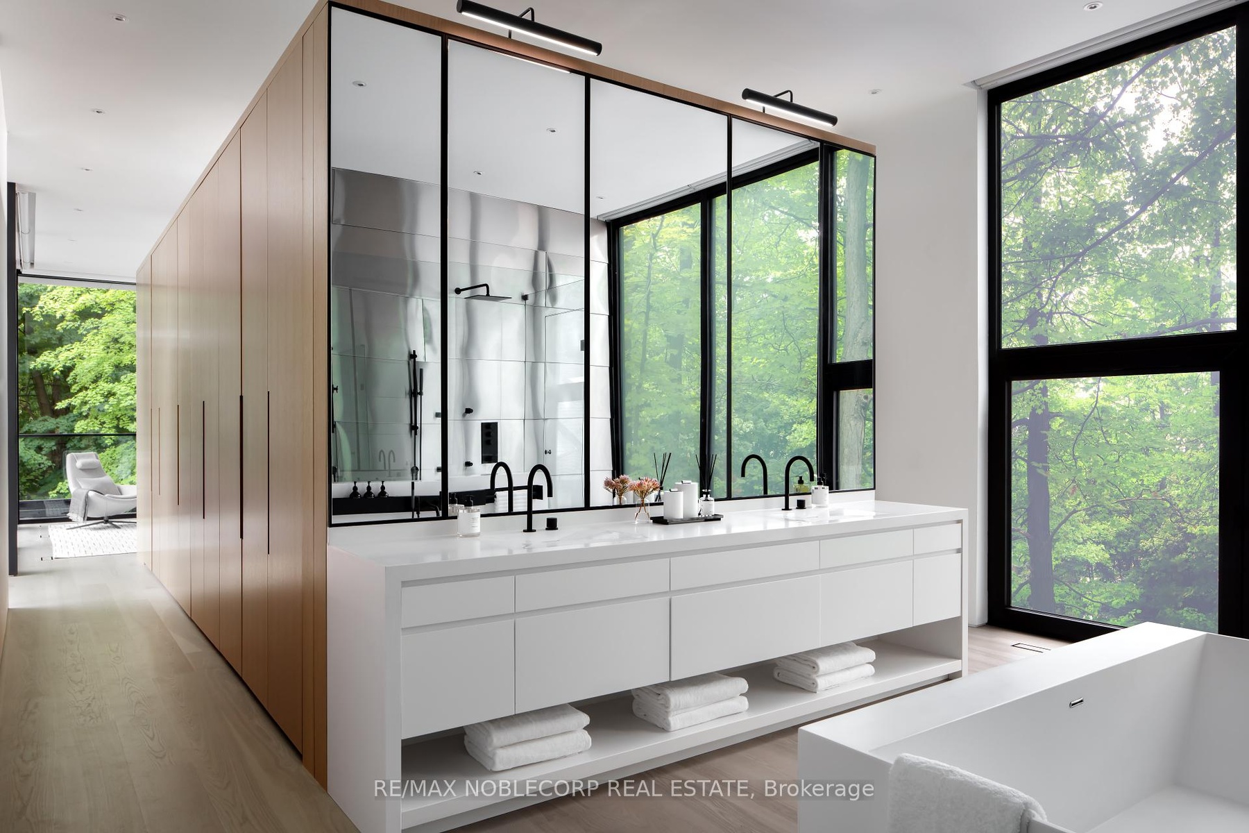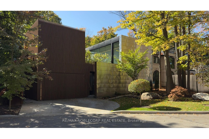 Inspired by the precision and versatility of a Swiss Army knife, this internationally award-winning, architecturally significant residence offers over 6,000 sq.ft. of luxury living on a private, forested ravine cul-de-sac. Designed with dynamic multi-level functionality, its dual wings are connected by a sleek glass bridge and clad in a striking blend of reflective titanium, simulated walnut, and rich black Palisade panels. A descending entrance introduces the main living area where a panoramic fireplace anchors open-concept spaces extending to the outdoors through a dramatic, folding glass hangar door. Every detail is engineered for seamless living and entertaining from the indoor/outdoor dining areas, hidden wine closet, and wet bar to the amenity-rich lower level featuring a full kitchen, gym, and theatre. The primary suite is a true retreat with his-and-hers closets, a spa-inspired ensuite, and a private balcony overlooking the ravine. Outside, a tiered infinity pool, integrated outdoor kitchen, and fire table are enveloped by nature, creating a breathtaking, resort-like oasis.