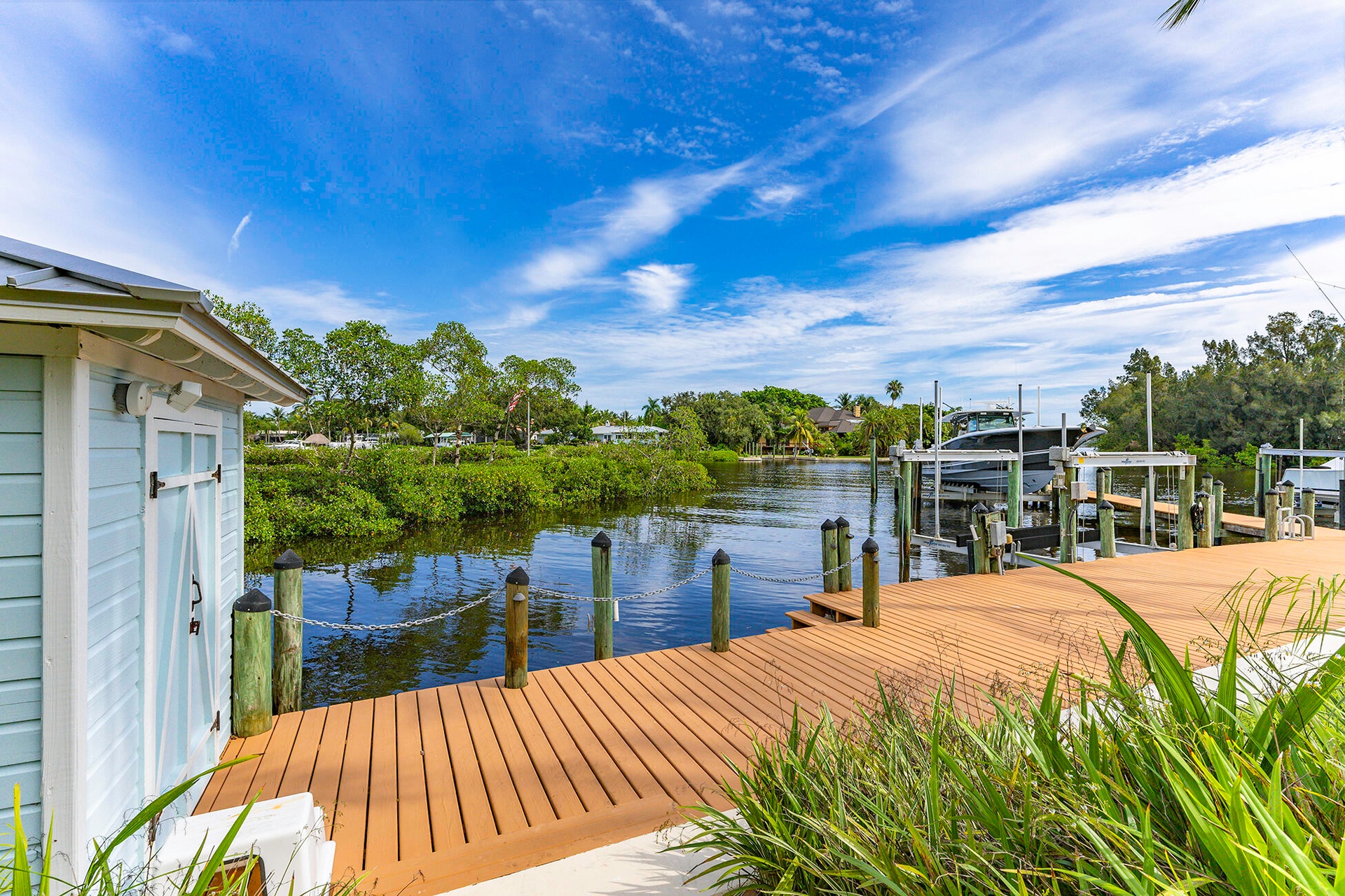 Drive home beneath the iconic banyan tunnel gives you goosebumps every time. At the end of this storied road, where the canopy opens to your gated driveway, a WATERFRONT estate awaits nearly an acre of PRIVACY and 500' of protected shoreline with views toward the INLET and ''The Crossroads.'' Enjoy deepwater dockage with two lifts and room for an 80' yacht. Reimagined in 2023/2024 with a new standing-seam metal roof, full impact glass, whole-house generator, and new garage doors, the main home blends timeless Key West architecture with modern coastal design. Inside are 4 bedrooms, 3.5 baths, a media room with wet bar, and a primary suite with balcony. Outdoors, a heated saltwater pool, tiki bar, lush landscaping, and guest house complete this rare retreat minutes from downtown Stuart.